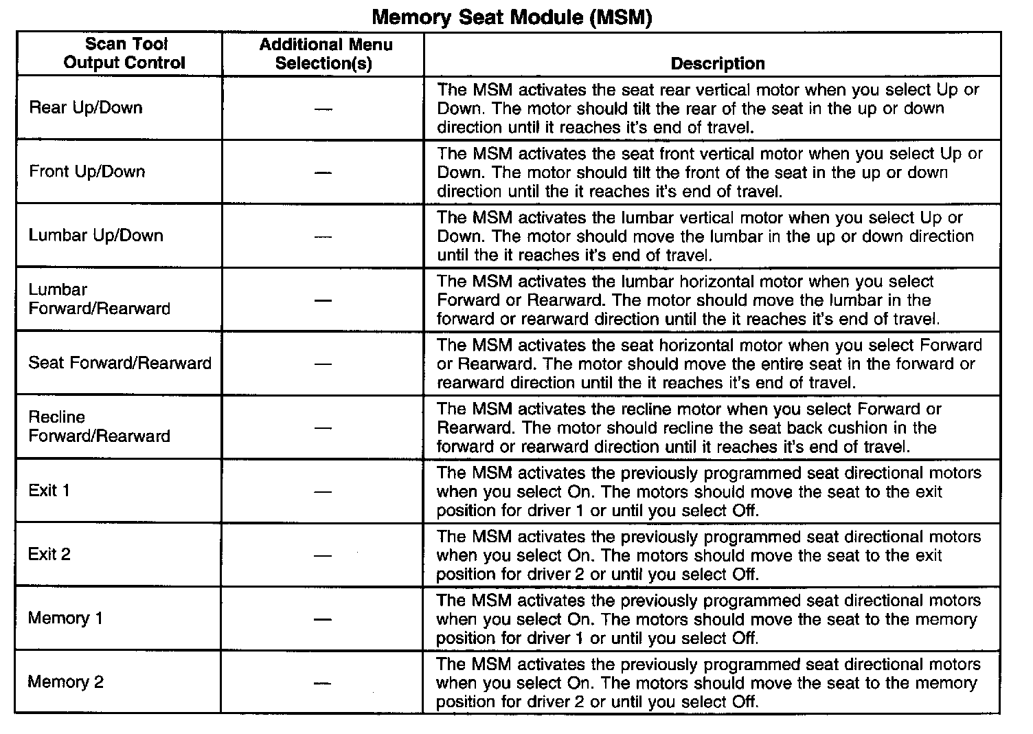 Scan Tool Output Controls - Memory Seat Module (MSM)
