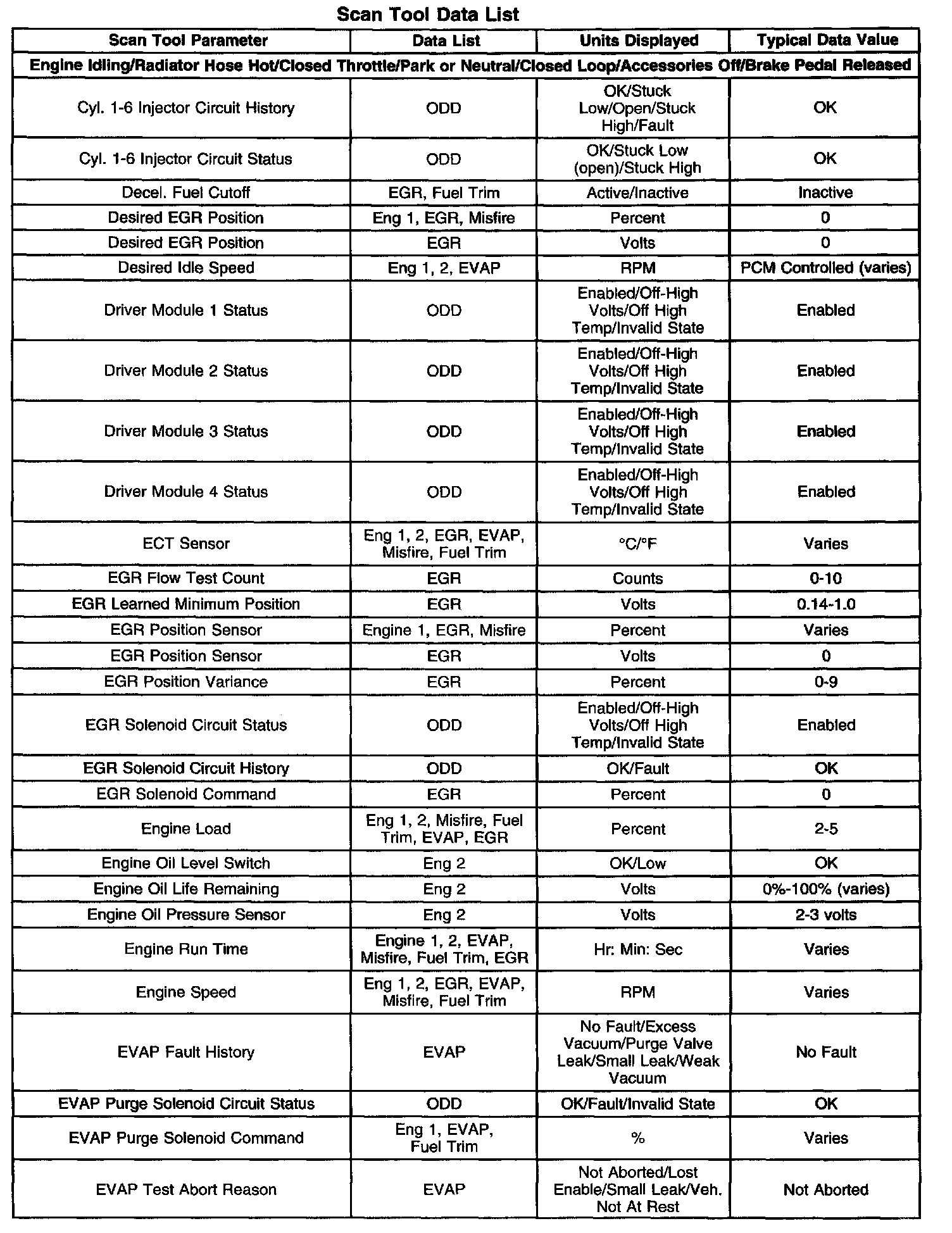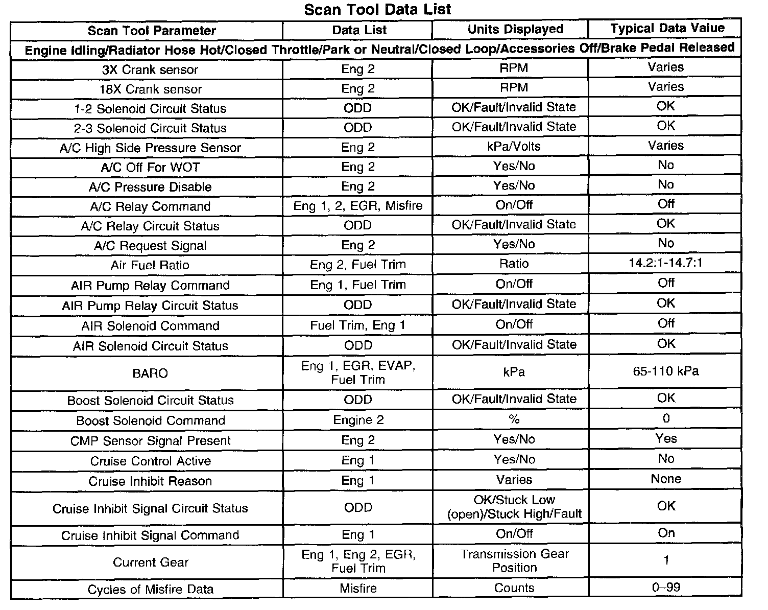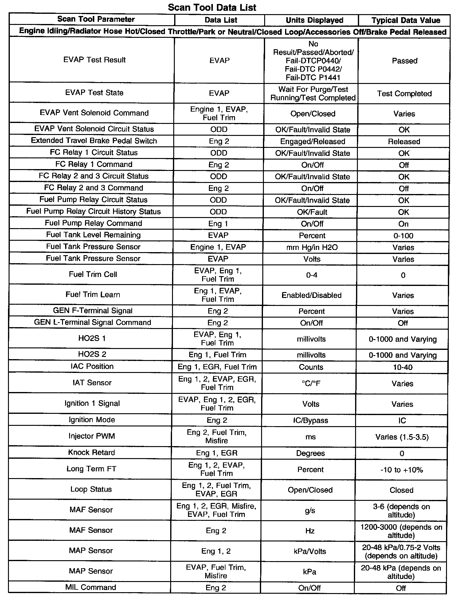 The Engine Scan Tool Data List contains all engine related parameters that are available on the scan tool. The list is arranged in alphabetical order. A given parameter may appear in any one of the data lists, and in some cases may appear more than once, or in more than one data list in order to group certain related parameters together.