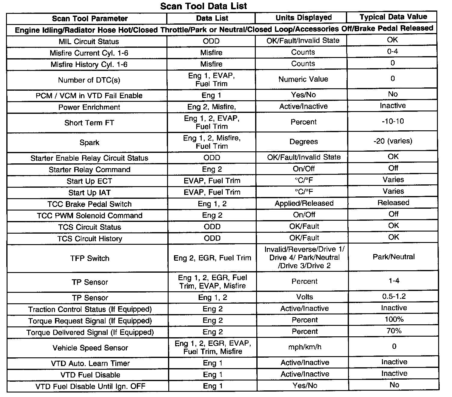 The column labeled Data List indicates where a parameter can be located on the scan tool. Refer to the scan tool operating manual for the exact locations of the data lists. The following is a description of each term listed: