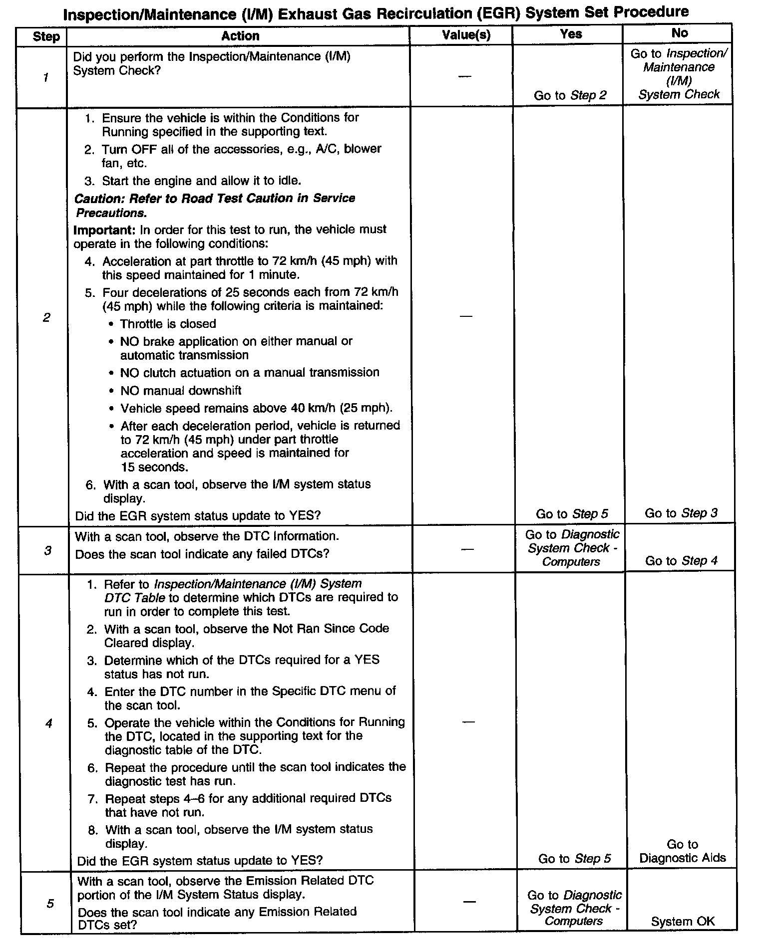 The control module only runs the EGR Active Tests during a gradual deceleration with a closed throttle and a vehicle speed above 40 km/h (25 mph). Several deceleration cycles may be necessary in order to accumulate a sufficient number of EGR flow samples. The procedure outlined in the table is for a clear, flat road. If the procedure is performed on a road with a slight down hill grade, the test may acquire the necessary sample counters in one or two decel trips. If the test is interrupted during the procedure, it may take more than three deceleration cycles to complete the test. If the status does not update, the test outlined in this procedure can be repeated until the I/M system status updates to YES.