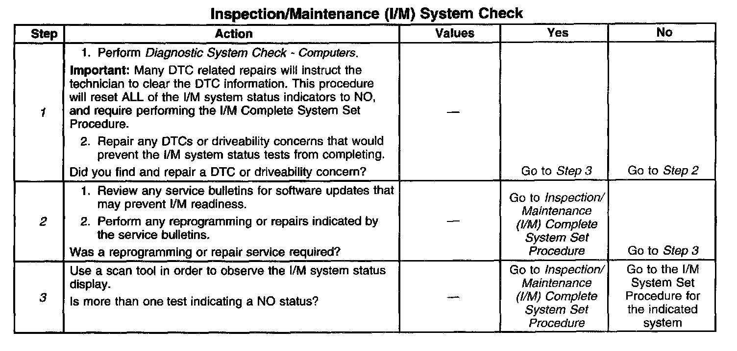1. Any DTCs set, even those that are not listed in the Inspection/Maintenance System DTC Table, may prevent the required DTCs from running. If there is any question as to whether a set DTC is disabling the required I/M diagnostic, review the Conditions for Running in the diagnostic procedures for the DTC required by the I/M diagnostic. A list of disabling DTCs, if applicable, is contained in the supporting text for that DTC.