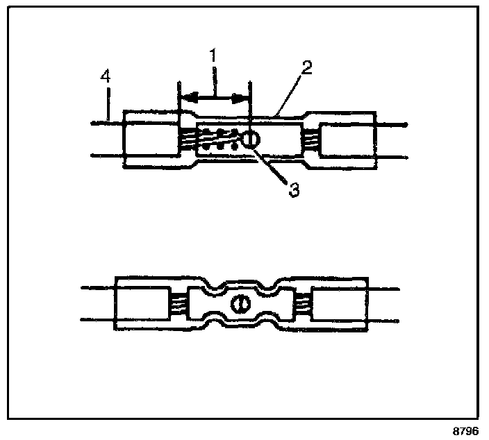 9. Insert the wires into the splice sleeve until the wire hits the barrel stop. The splice sleeve has a stop in the middle of the barrel in order to prevent the wire from passing through the splice (3).