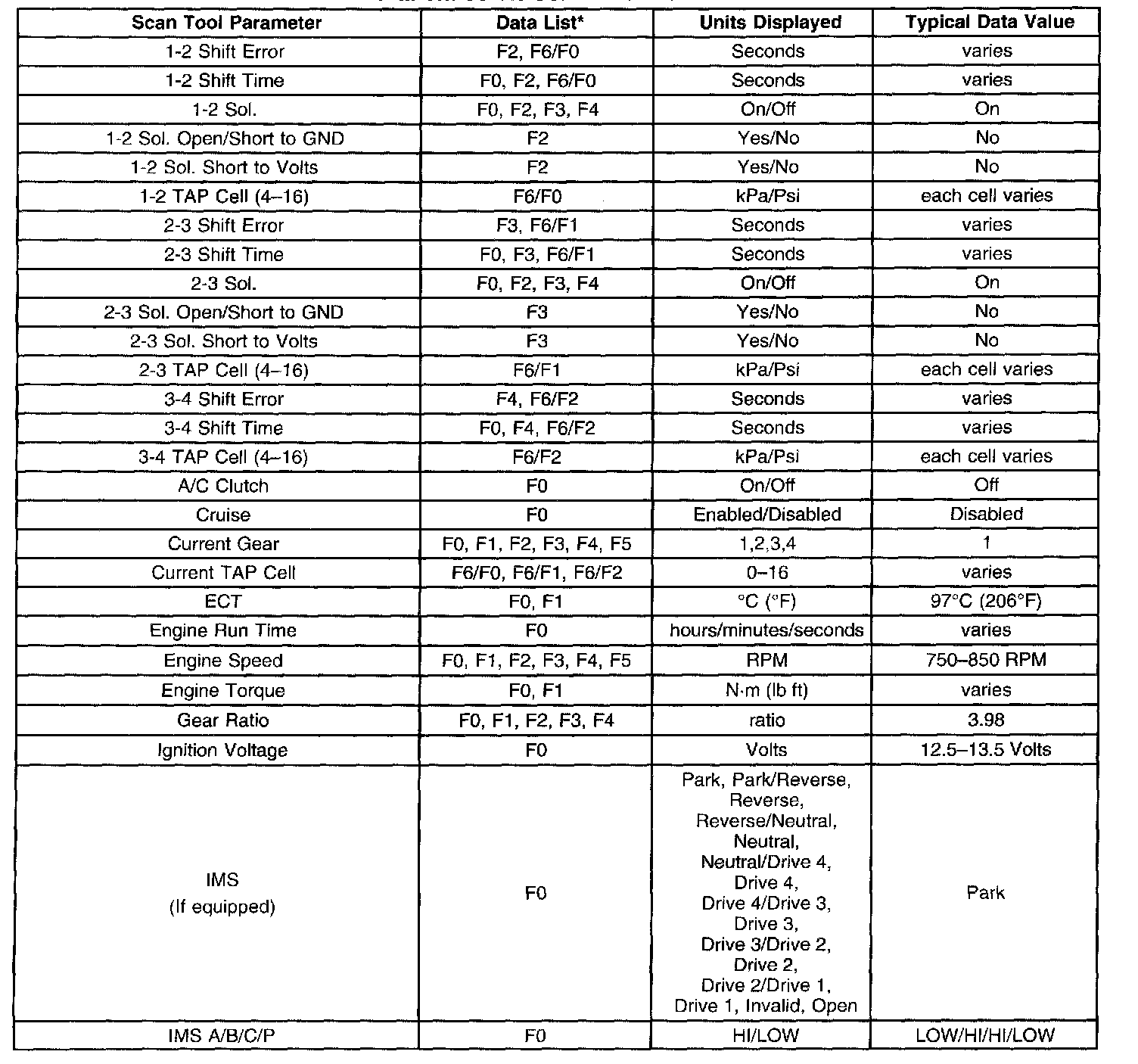 Only the parameters listed below are used in this manual for diagnosing. If a scan tool displays other parameters, the values are not recommended by General Motors for use in diagnosis. Scan tool values below were recorded under the following conditions:
