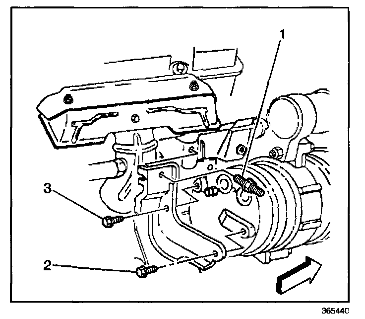 8. Remove the A/C compressor rear bolts (2, 3).