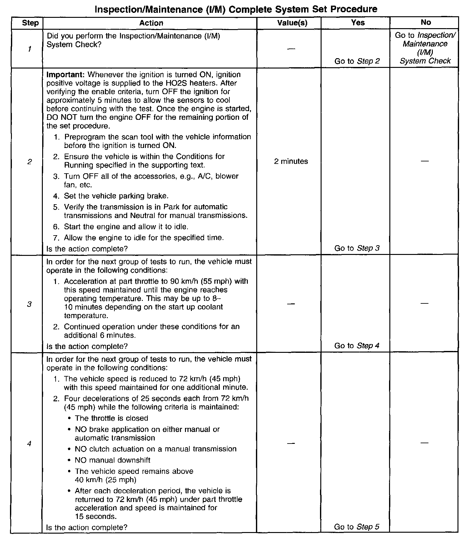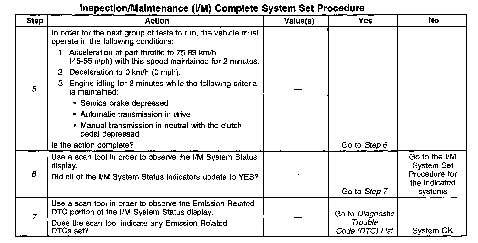 DESCRIPTIONThe purpose of the I/M Complete System Set Procedure is to satisfy the enable criteria necessary to execute all of the I/M readiness diagnostics, and complete the trips for those particular diagnostics. When all diagnostic tests are completed, the I/M System Status indicators are set to YES. Perform this test when more than one or all of the I/M System Status indicators are set to NO.