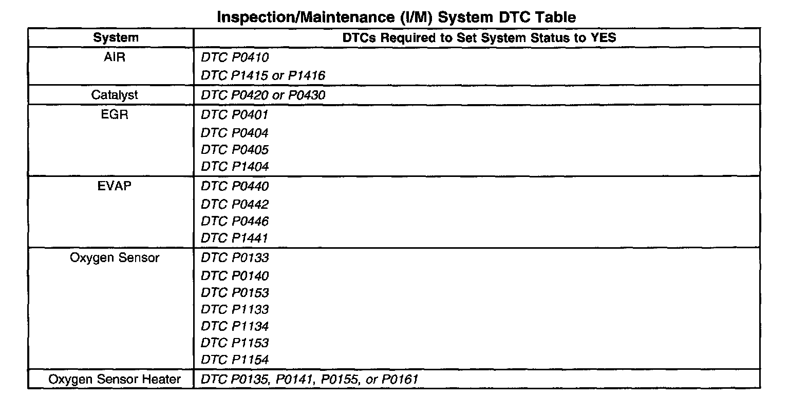 Inspection/Maintenance (I/M) System DTC Table: