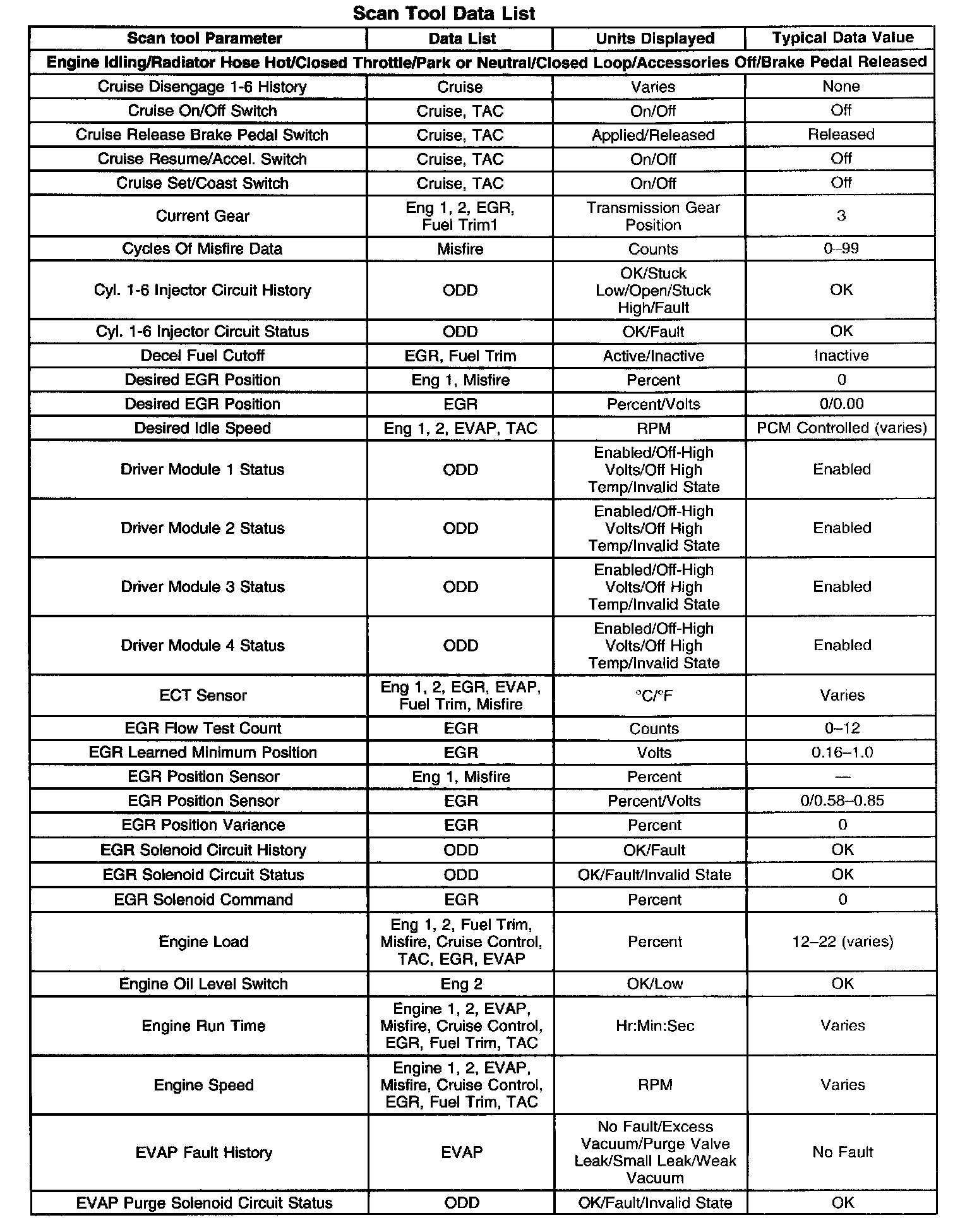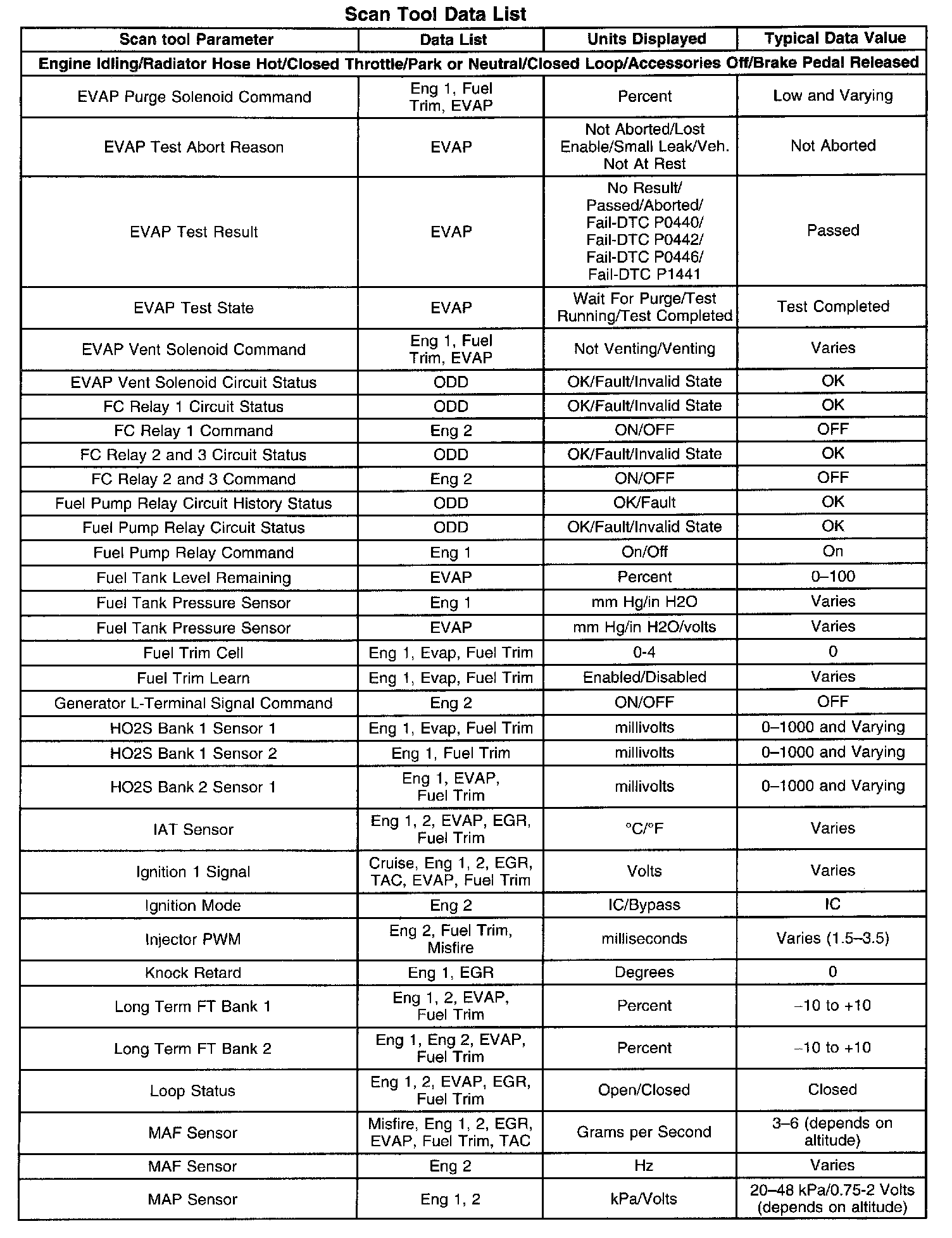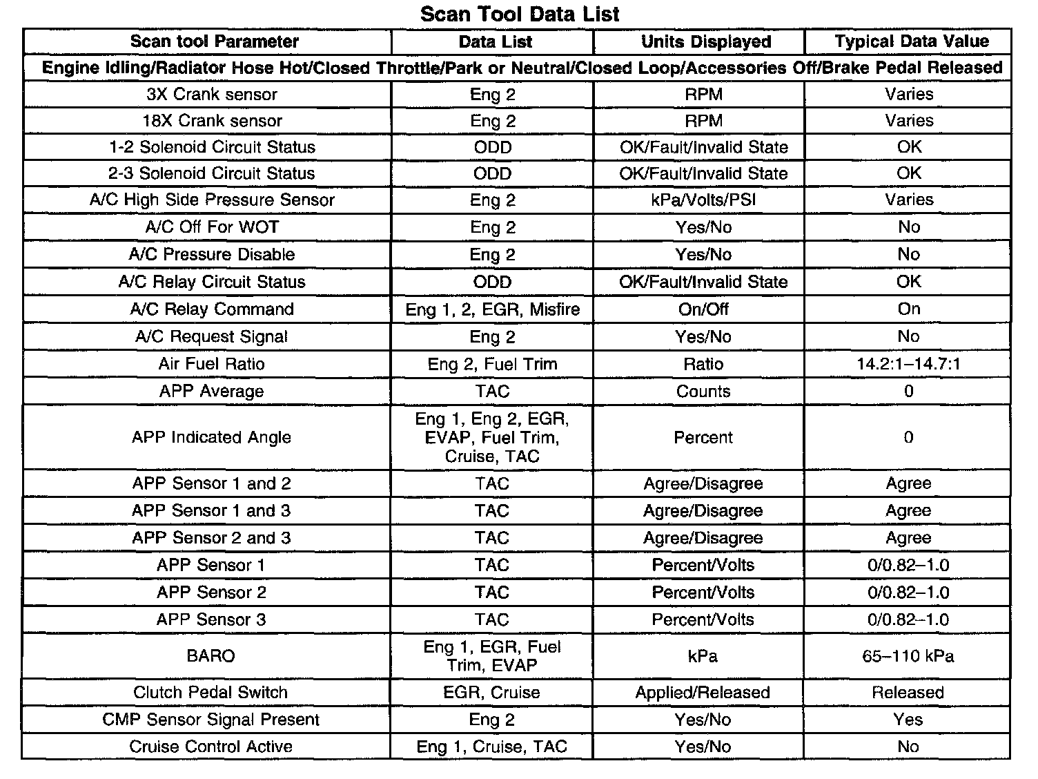 The Engine Scan Tool Data List contains all engine related parameters that are available on the scan tool. The list is arranged in alphabetical order. A given parameter may appear in any one of the data lists, and in some cases may appear more than once, or in more than one data list in order to group certain related parameters together.