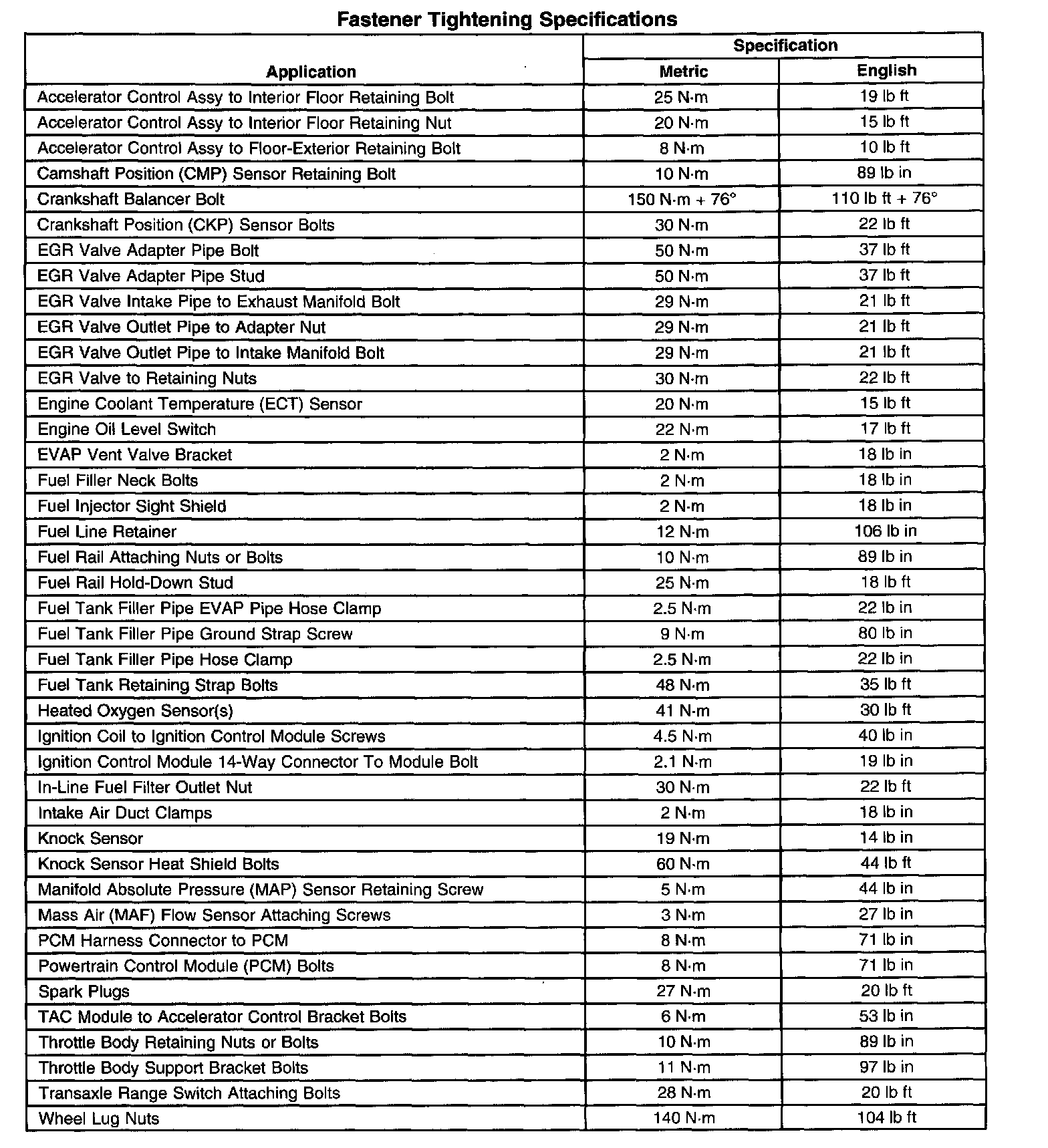 Fastener Tightening Specifications: