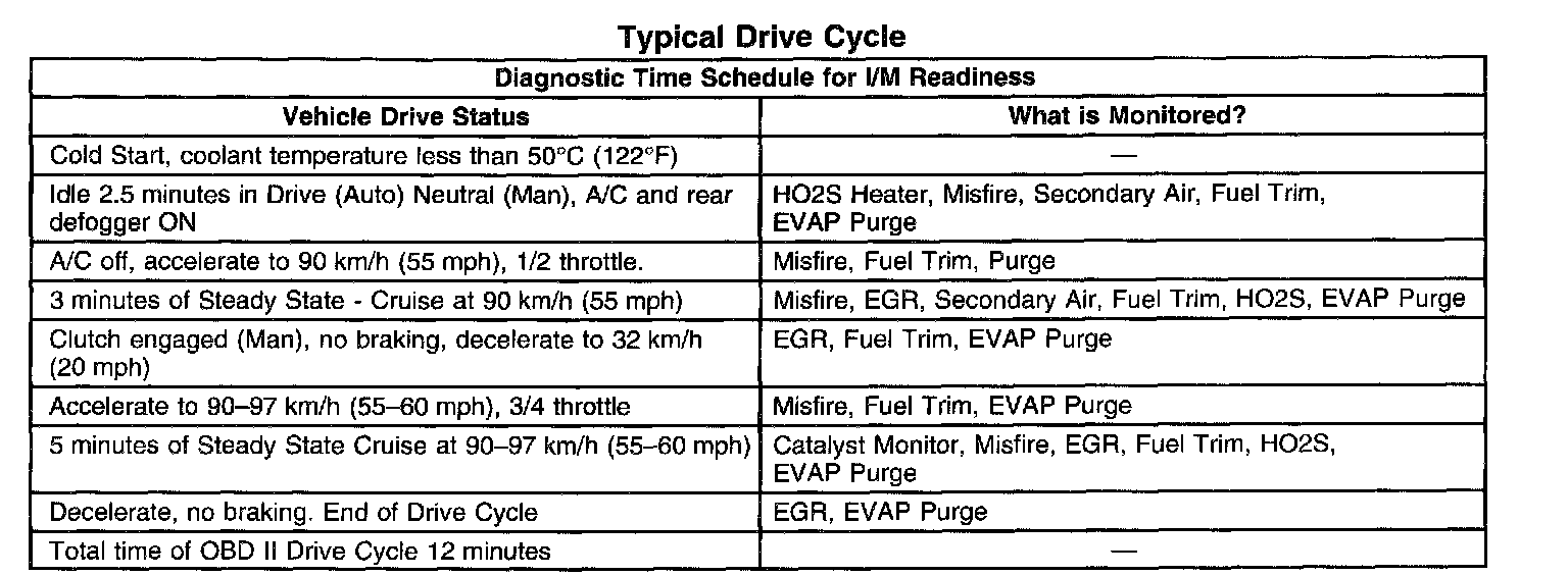 IMPORTANT: The System Status display indicates only whether the test has been completed. The System Status display does not indicate whether the test has passed. If a Failed Last Test indication is present for a DTC associated with one of the above systems, diagnosis and repair is necessary in order to meet the I/M requirement. Verify that the vehicle passes all of the diagnostic tests associated with the displayed System Status prior to returning the vehicle to the customer. Refer to the Typical Drive Cycle table to use as a guide to complete the I/M System Status tests. More than one drive cycle may be necessary.