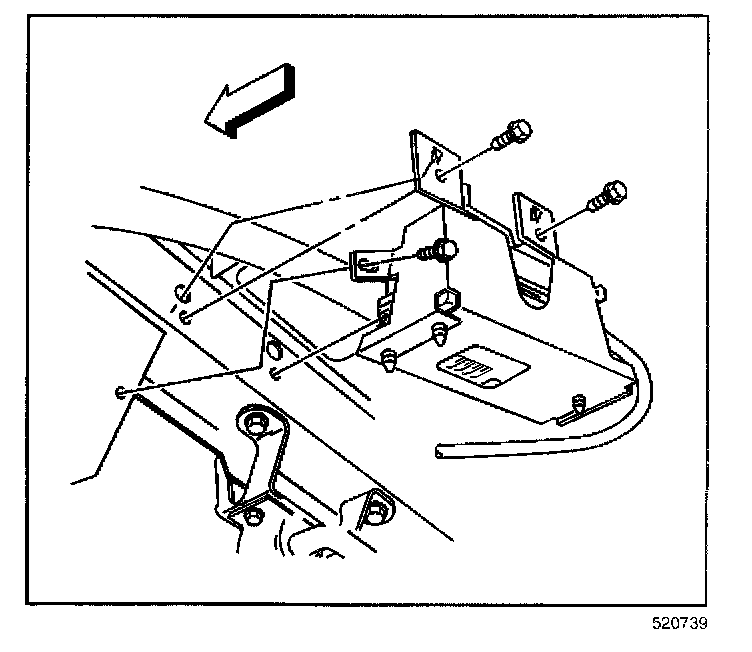 10. Install the cruise control module and bracket to the left side engine compartment outer rail.