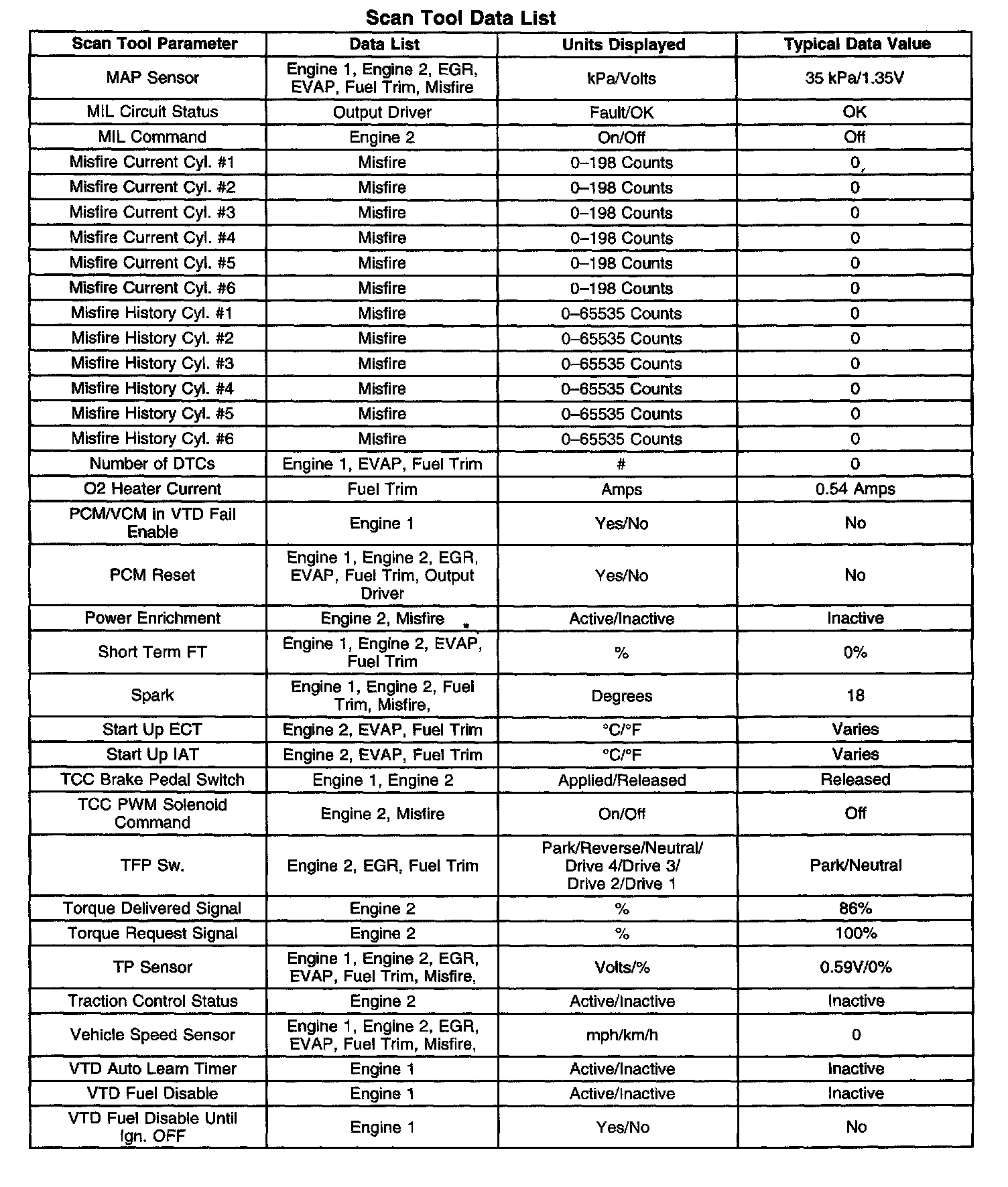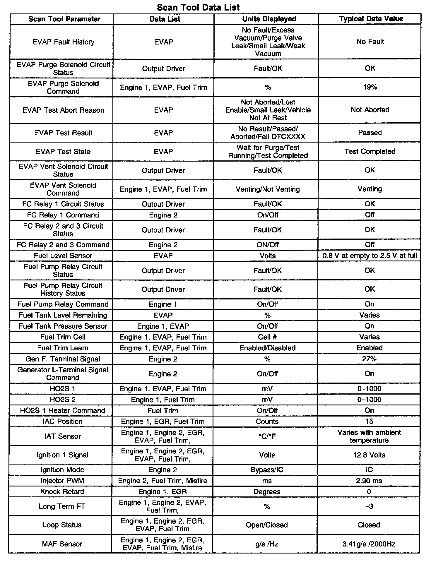 ^ Engine Data 1-Contains general information regarding fuel delivery, Idle Air Control (IAC) position, Heated Oxygen Sensor (HO2S1), HO2S2, and other basic engine operating conditions.