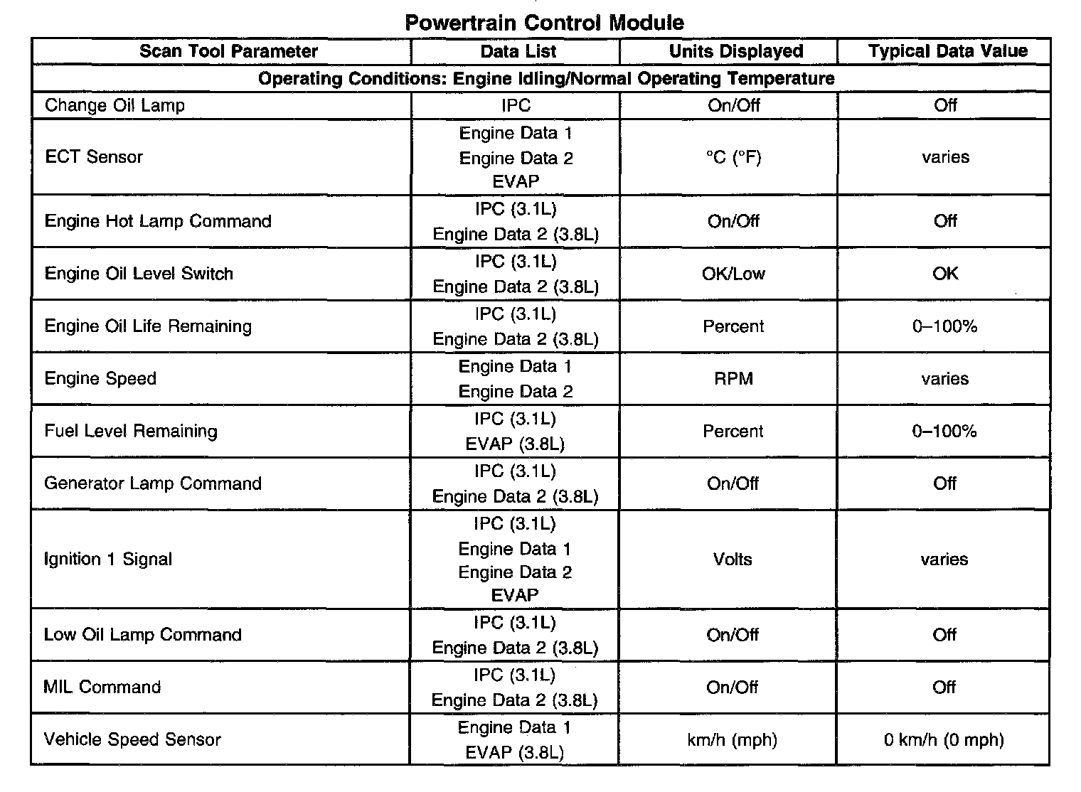 Scan Tool Data List - Powertrain Control Module (PCM)