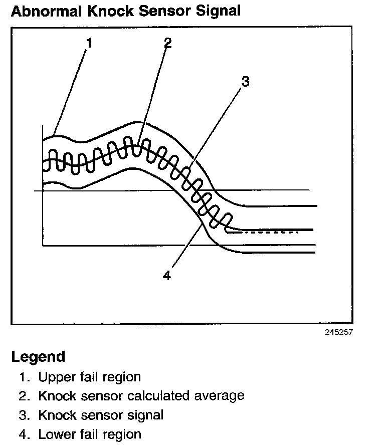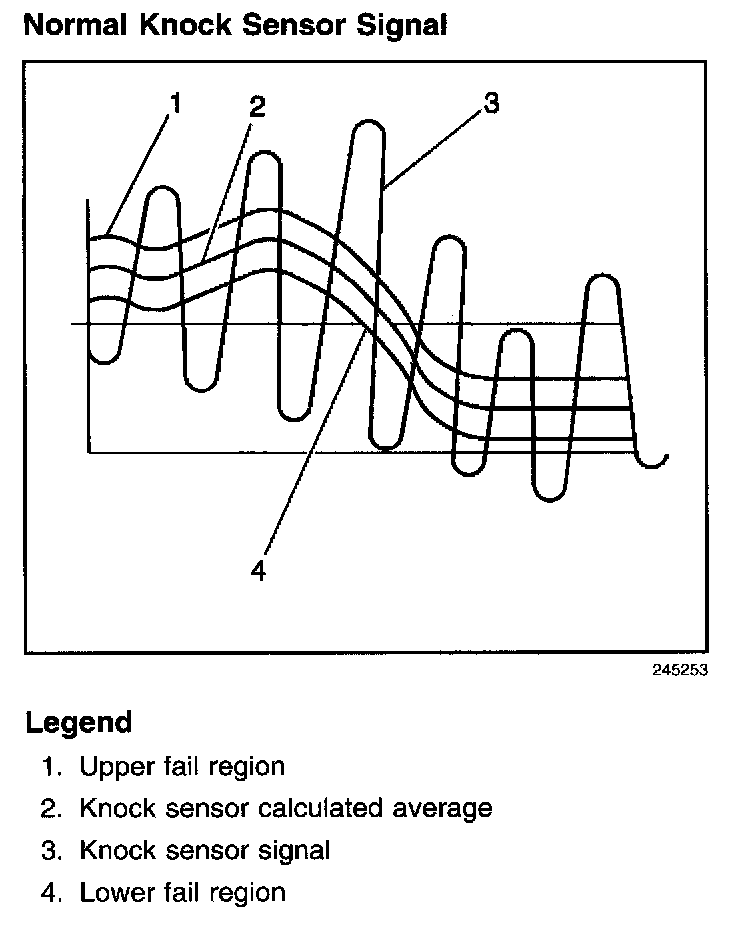The Powertrain Control Module (PCM) uses a knock sensors to detect abnormal vibration in the engine (detonation/spark knock). Mounted on the engine block, the knock sensors produces an AC voltage signal at all engine speeds and loads. The PCM then adjusts the spark timing based on the amplitude and frequency of the KS signal. The PCM uses the KS signal to calculate an average voltage. Then, the PCM assigns a voltage range above and below the average voltage value. The PCM checks the KS and related wiring by comparing the actual knock signal to the assigned voltage range. A normal KS signal should vary outside the assigned voltage range as shown in the NORMAL KS figure. If the PCM detects a KS signal within the assigned voltage range as shown in the ABNORMAL figure the applicable DTC will be set.