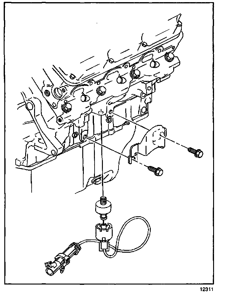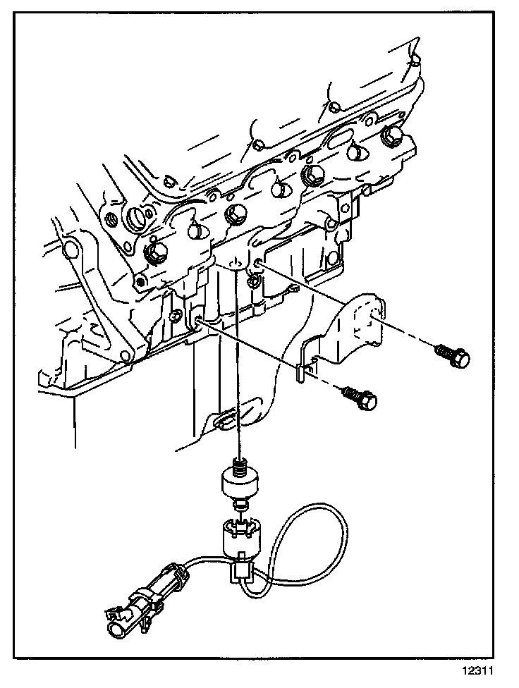 2. Install the knock sensor heat shield mounting bolt located under the freeze plug (or block heater if equipped).