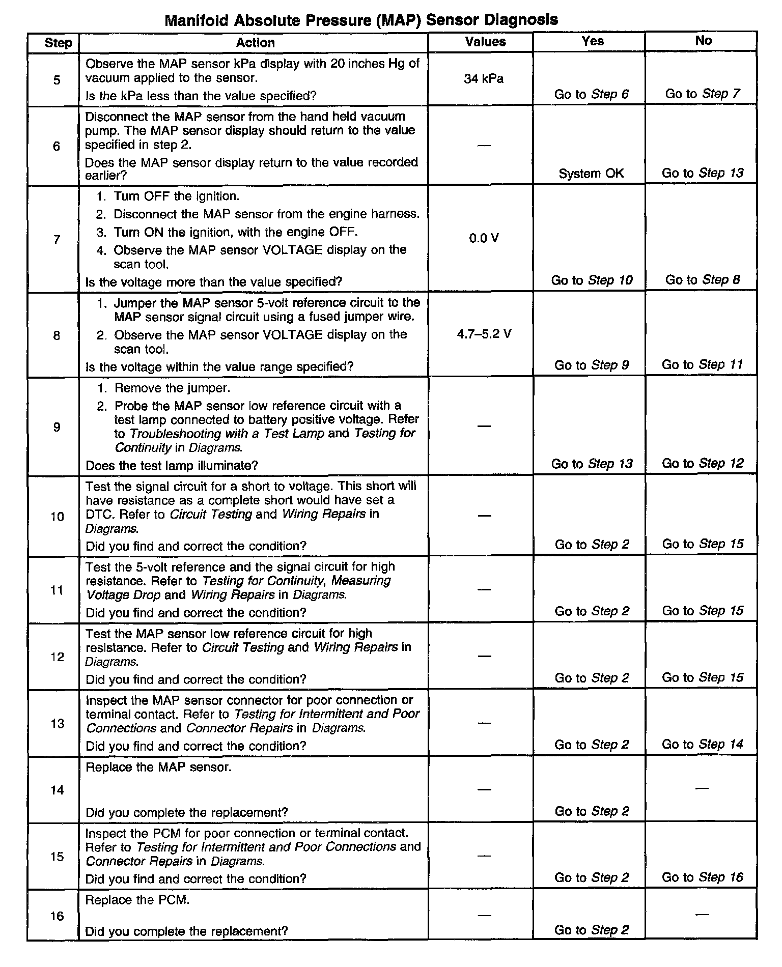 CIRCUIT DESCRIPTIONThe Manifold Absolute Pressure (MAP) sensor responds to pressure changes in the intake manifold which gives an indication of the engine load. The MAP sensor has a 5-volt reference circuit, a low reference circuit, and a signal circuit. The Powertrain Control Module (PCM) supplies 5 volts to the MAP sensor on the 5-volt reference circuit and provides a ground on the low reference circuit. The MAP sensor provides a signal to the PCM on the signal circuit which is relative to the pressure changes in the manifold. With low manifold absolute pressure such as during idle or deceleration, the PCM should detect a low signal voltage. With high manifold absolute pressure such as ignition ON, with the engine OFF or Wide-open Throttle (WOT), the PCM should detect a high signal voltage. Certain vehicle models will also use the MAP sensor in order to calculate the Barometric Pressure (BARO) when the ignition switch is turned ON, with the engine OFF. The BARO reading may also be updated whenever the engine is operated at wide-open throttle. The PCM monitors the MAP sensor signal for voltage outside of the normal range. If the PCM detects a MAP sensor signal voltage that is excessively high, DTC P0108 will set. If the PCM detects a MAP sensor signal voltage that is excessively low, DTC P0107 will set.
