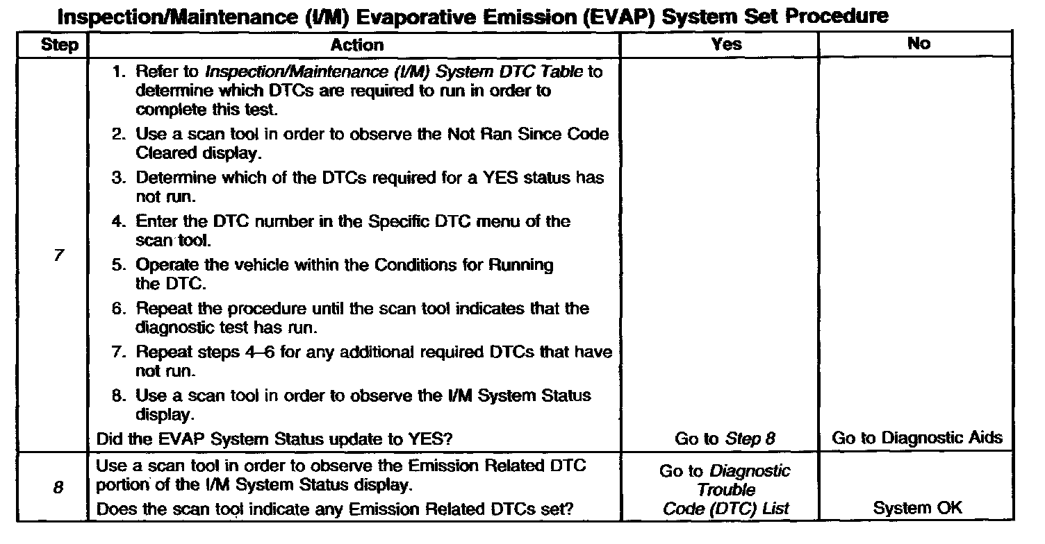 6. This step is to identify a first failure of a type B DTC. A DTC only appears on the I/M System Status display when it becomes a MIL illuminating DTC. This occurs on the second failure of a type B DTC. A first failure of a type B DTC will not allow the I/M System Status to update to YES. Refer to Diagnostic Aids.