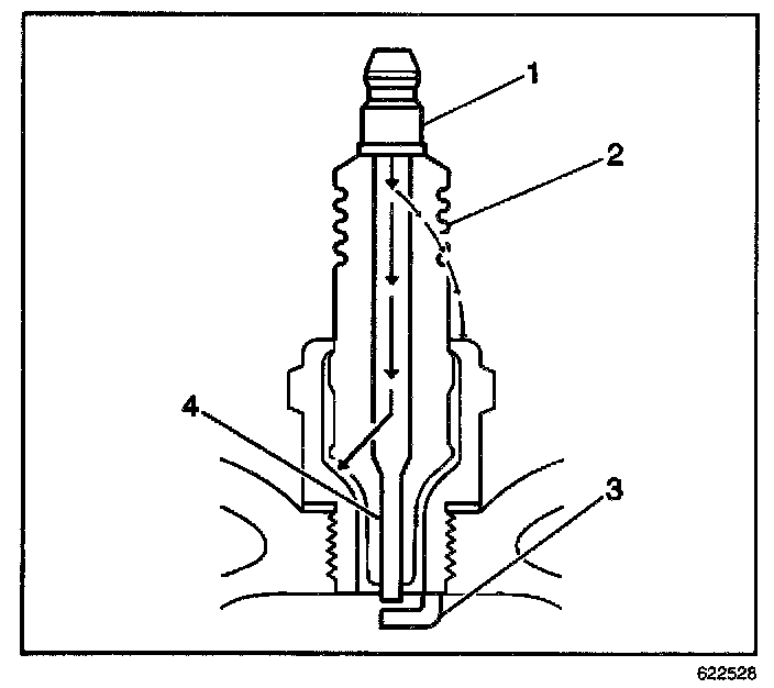 ^ Inspect the insulator (2) for cracks. All or part of the electrical charge may arc through the crack instead of the electrodes (3, 4).