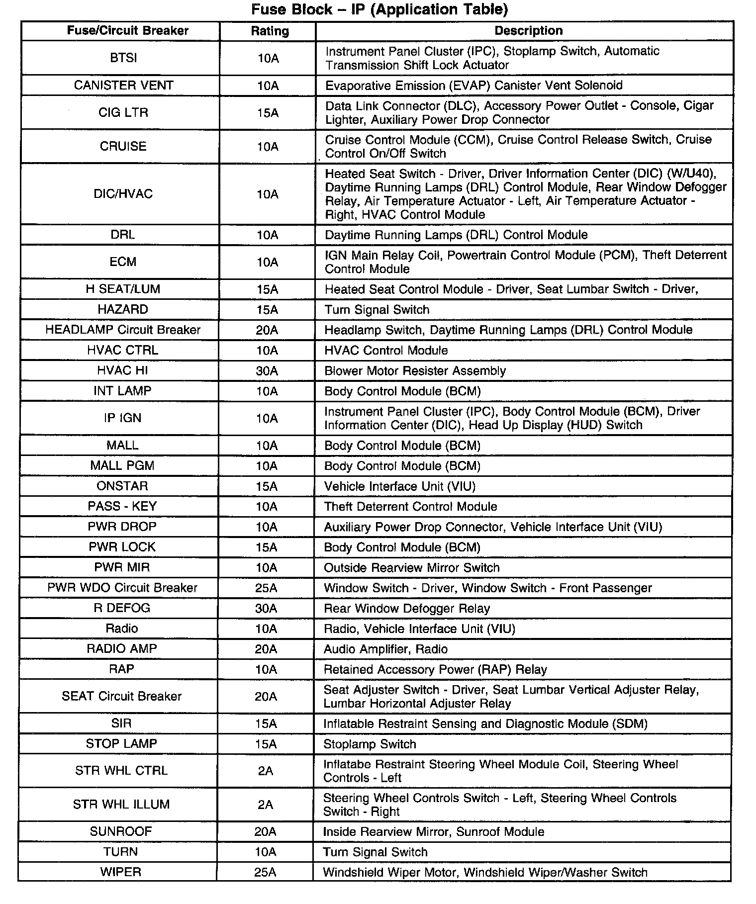Fuse Block - IP (Application Table):