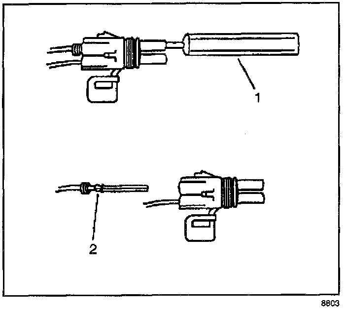 4. Insert the Weather Pack(R) terminal removal tool into the front (mating end) of the connector cavity until it rests on the cavity shoulder (1).
