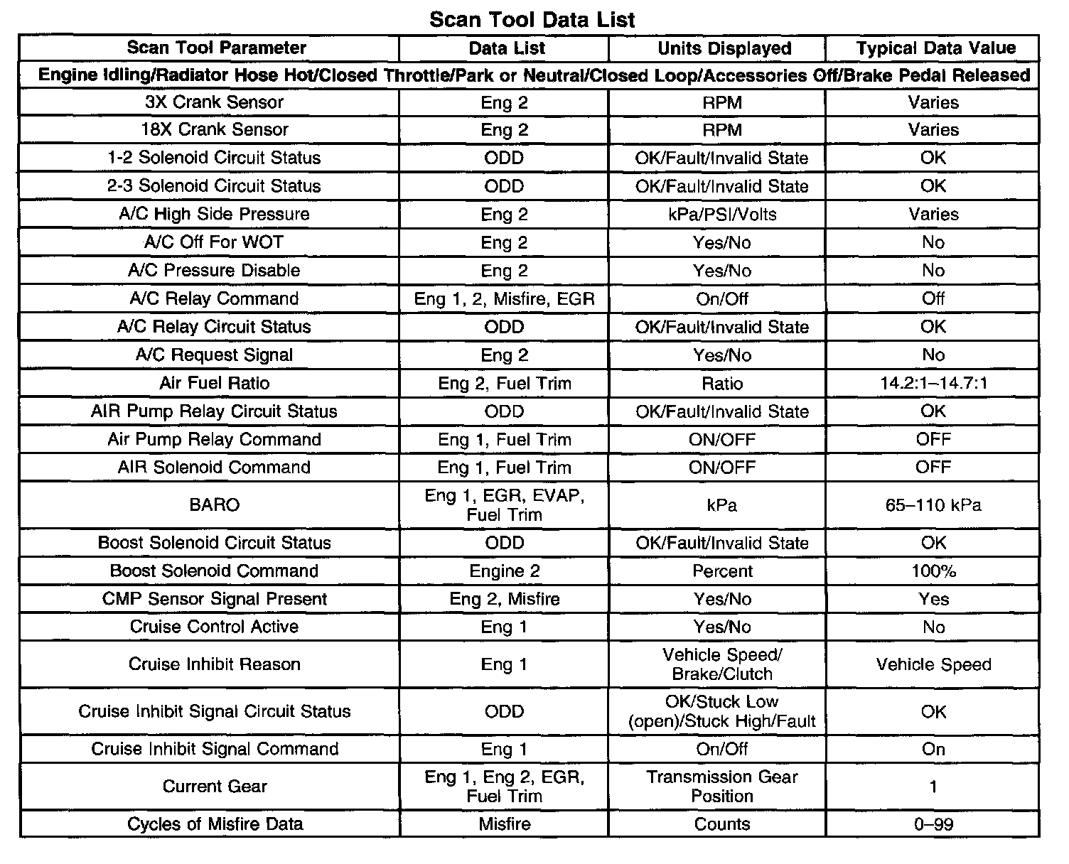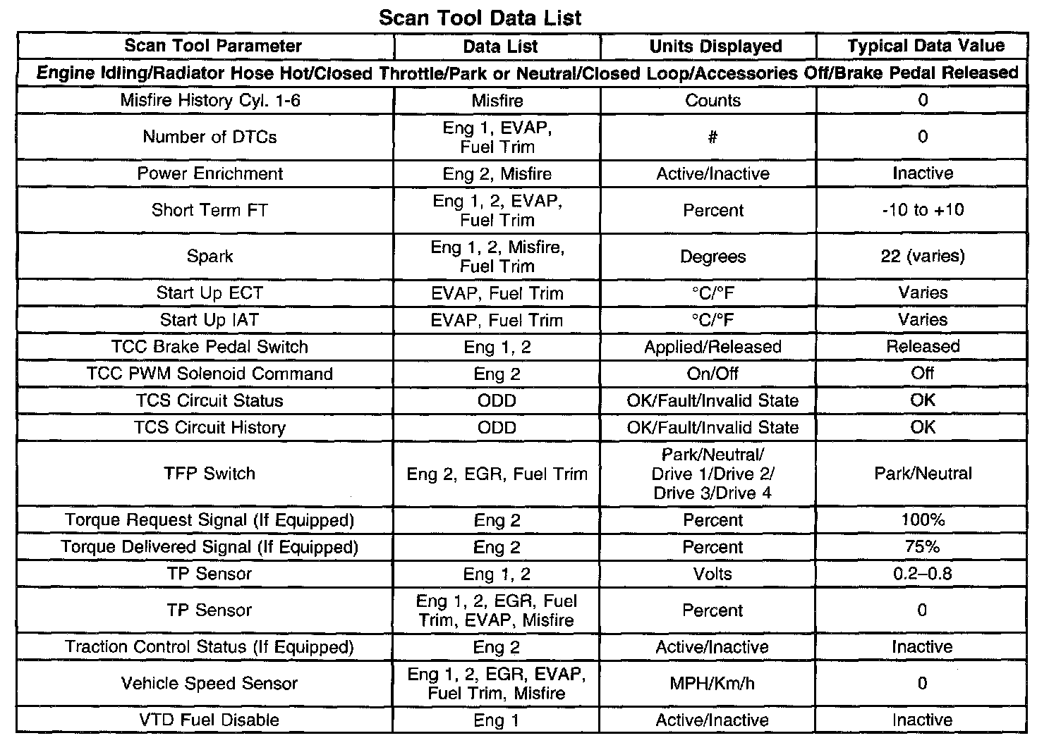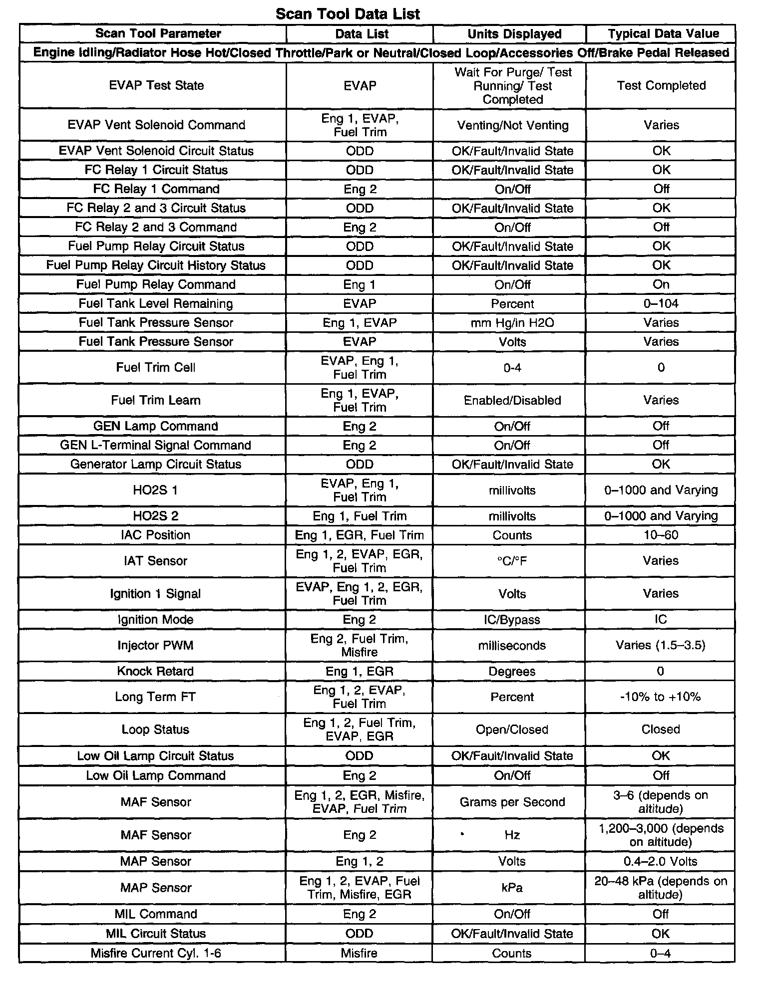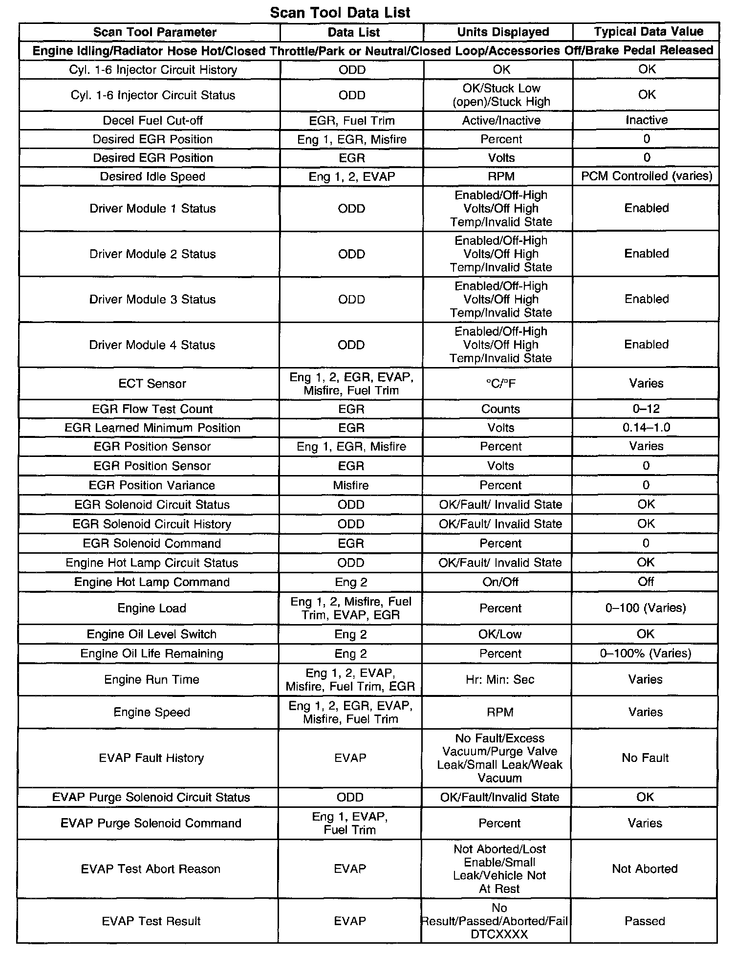 The Engine Scan Tool Data List contains all engine related parameters that are available on the scan tool. The list is arranged in alphabetical order. A given parameter may appear in any one of the data lists, and in some cases may appear more than once, or in more than one data list in order to group certain related parameters together.