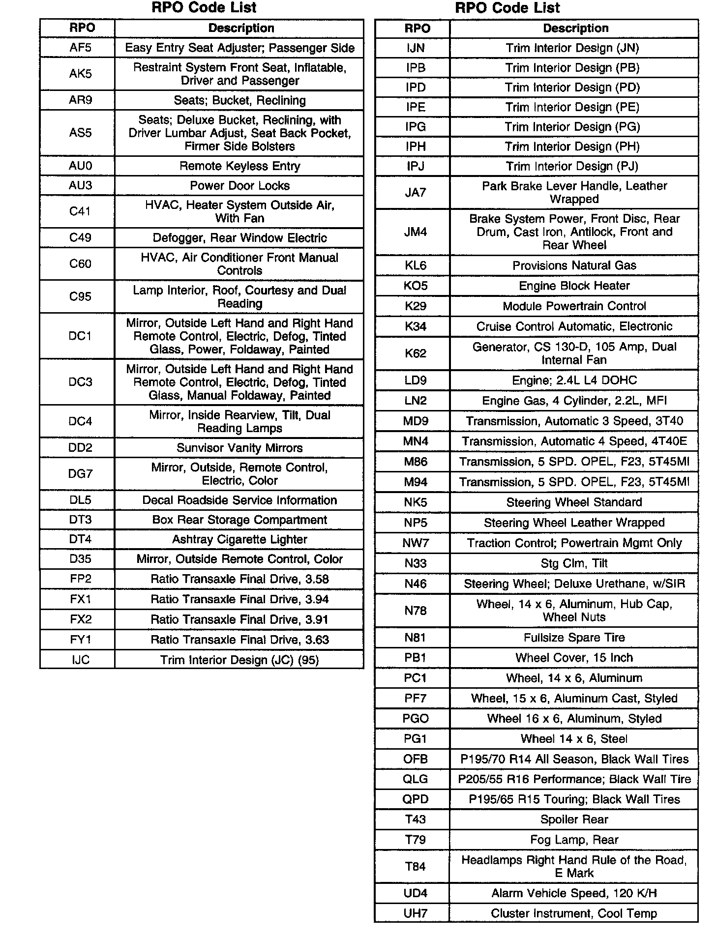RPO Codes