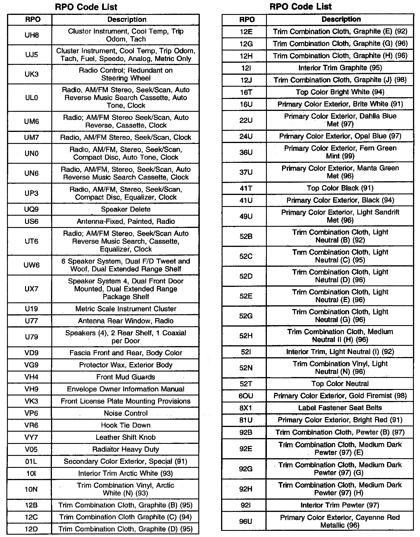 RPO Code List (Part 2 Of 2):
