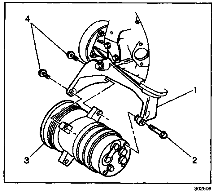 4. Install the compressor (3) to the compressor mounting bracket (1).