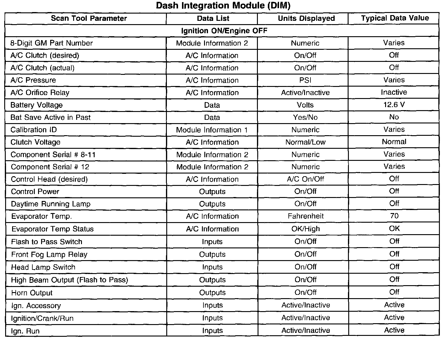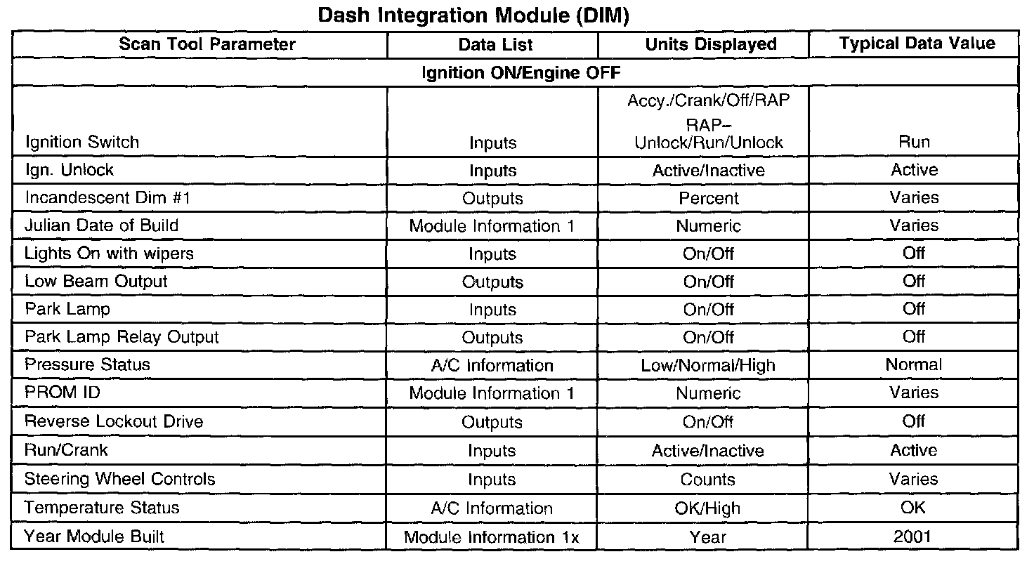 Scan Tool Data List - Dash Integration Module (DIM)