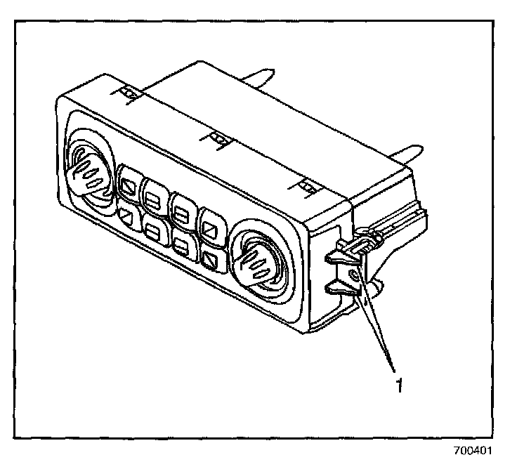 2. Pinch the tabs (1) on the control head and pull rearward on the HVAC control module to remove from the instrument panel.