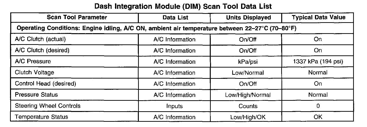 Use the Scan Tool Data Display Values and Definitions Information in order to assist in diagnosing the Instrument Panel Integration Module (IPM) problems. Compare the vehicles actual scan tool data with the typical data display value table information. Use the data information in order to aid in understanding the nature of the problem when the vehicle does not match with the typical data display values.