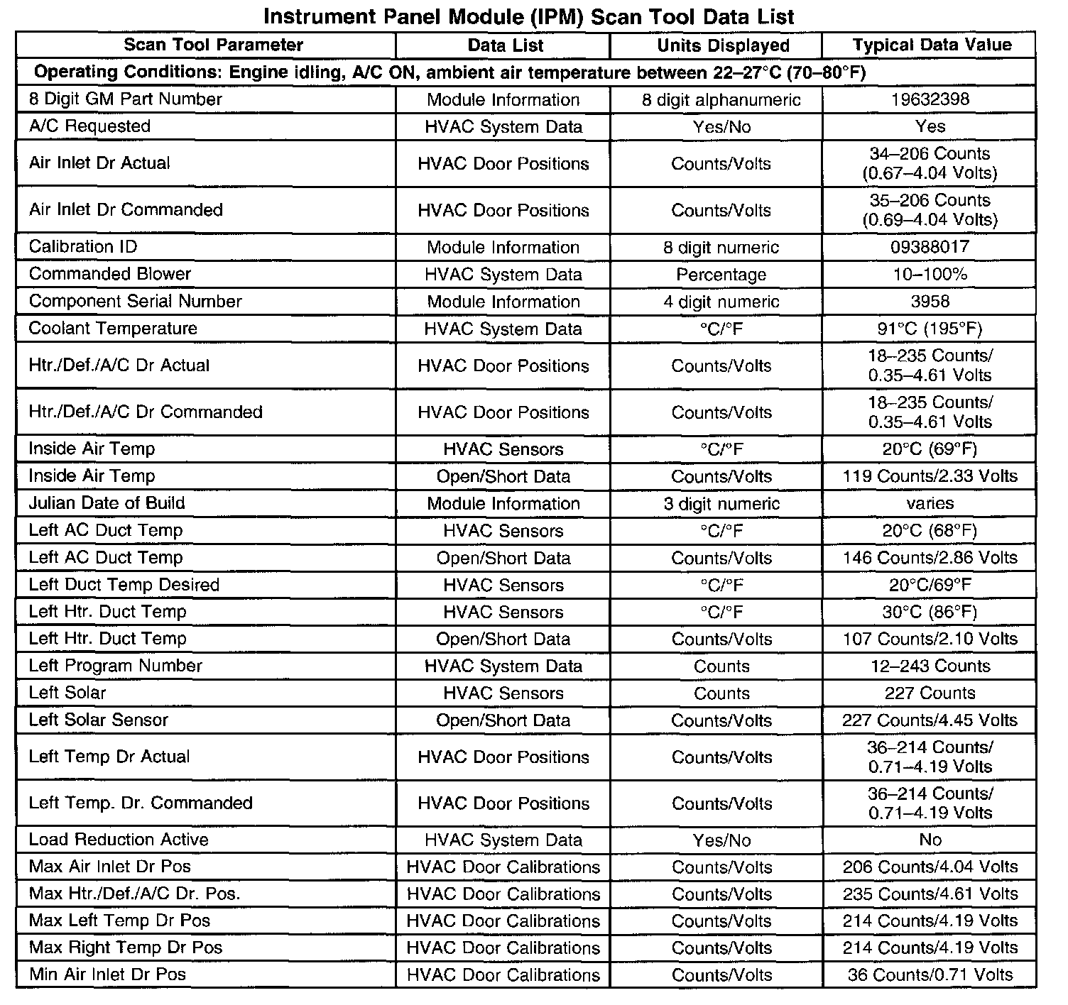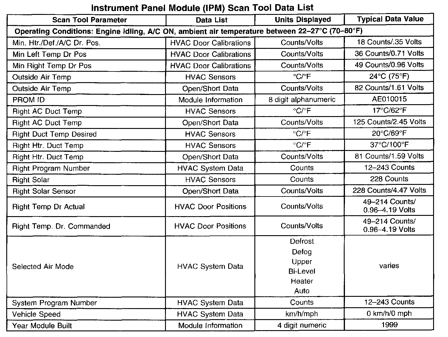 Instrument Panel Module (IPM) Scan Tool Data List Part 2: