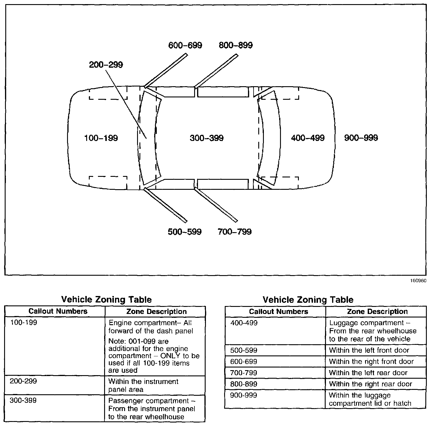 All grounds, in-line connectors, pass-through grommets, and splices have identifying numbers that correspond to where they are located in the vehicle. The table explains the numbering system.