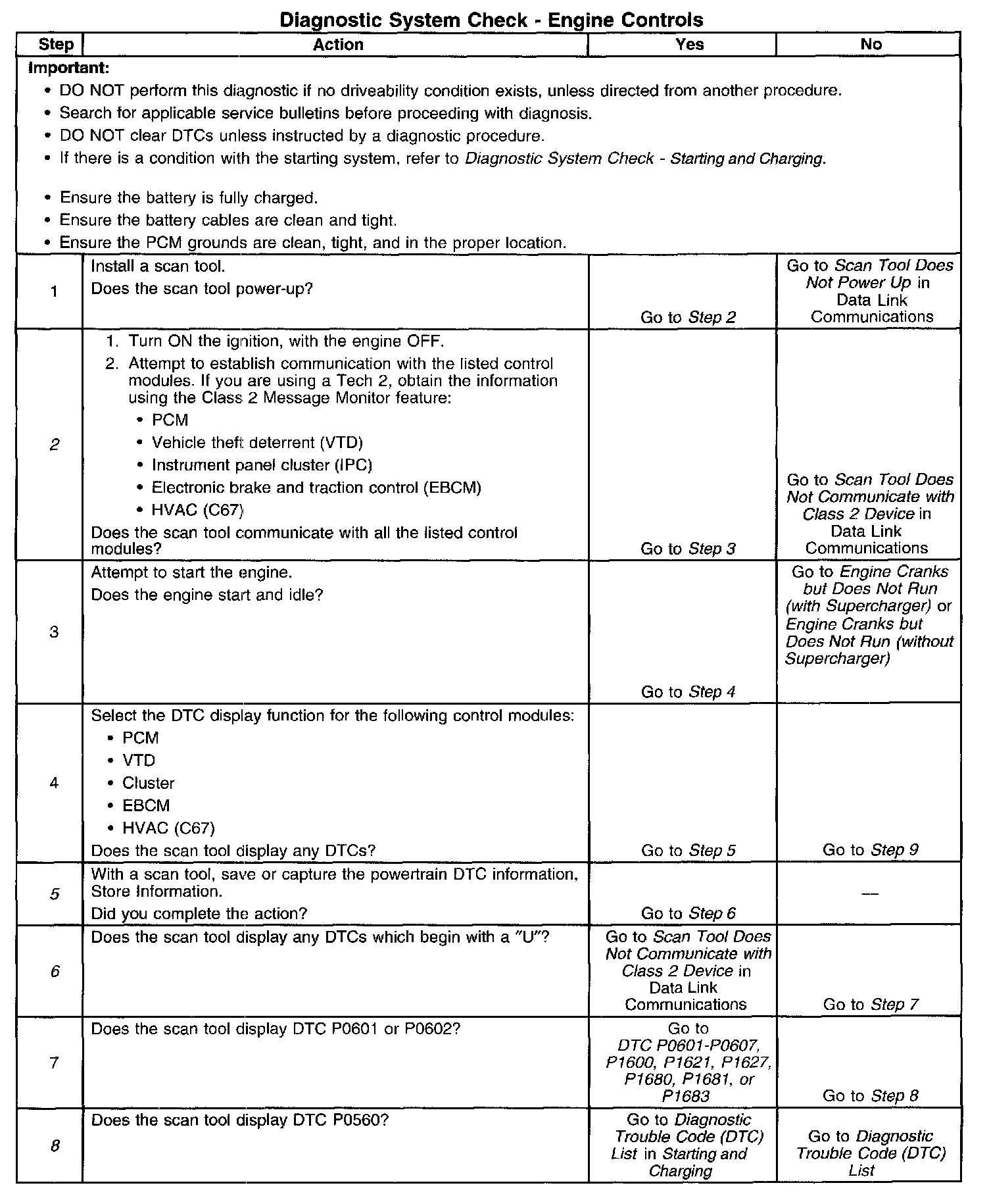 DESCRIPTIONThe Diagnostic System Check is an organized approach to identifying a condition created by an electronic engine control system malfunction. The Diagnostic System Check must be the starting point for any driveability concern. The Diagnostic System Check directs the service technician to the next logical step in diagnosing the concern. Understanding the table and using the table correctly reduces diagnostic time and prevents the replacement of good parts.