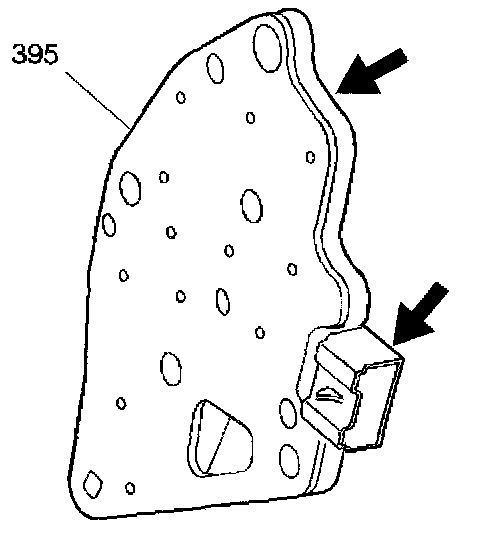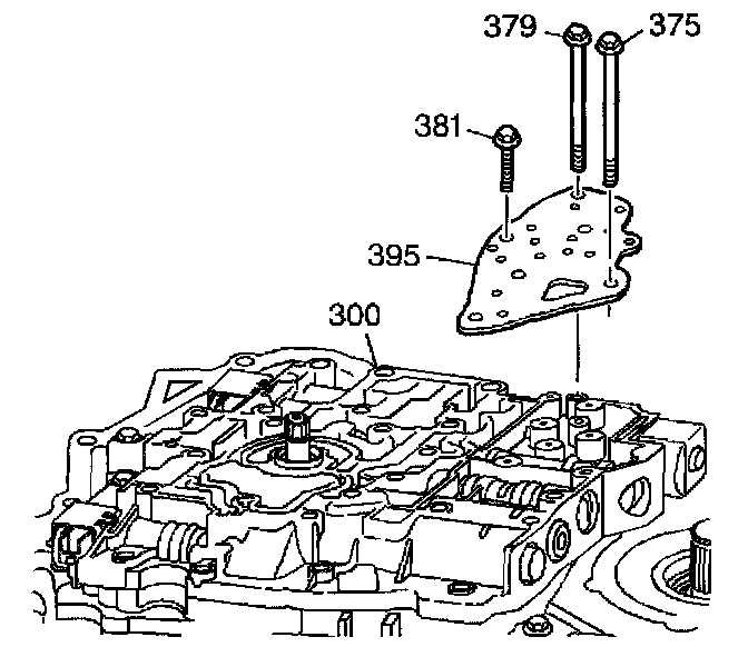 3. Remove the control valve body bolts (375, 379 and 381) that mount the fluid pressure manual valve position switch to the control valve body (300).