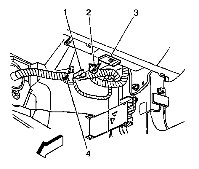 2. Route the inflatable restraint I/P module pigtail (4) down through the I/P (1).