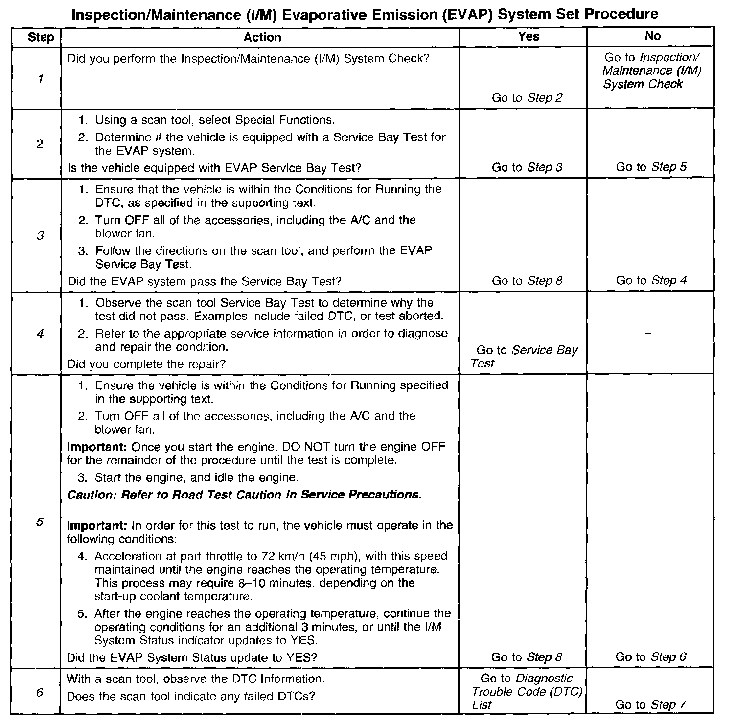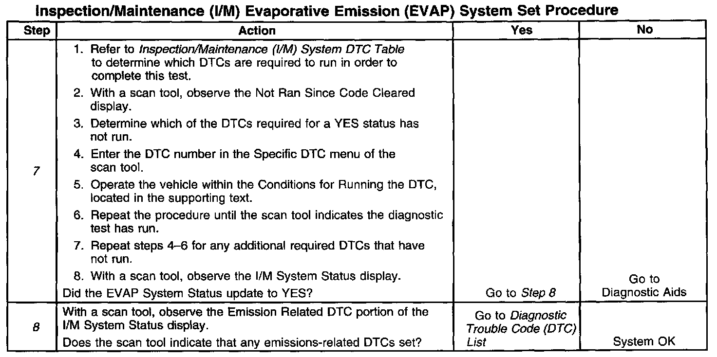 6. This step is to identify a first failure of a type B DTC. A DTC only appears on the I/M System Status display when the DTC becomes a MIL-illuminating DTC. This occurs on the second failure of a type B DTC. A first failure of a type B DTC will not allow the I/M System Status to update to YES. Refer to Diagnostic Aids.