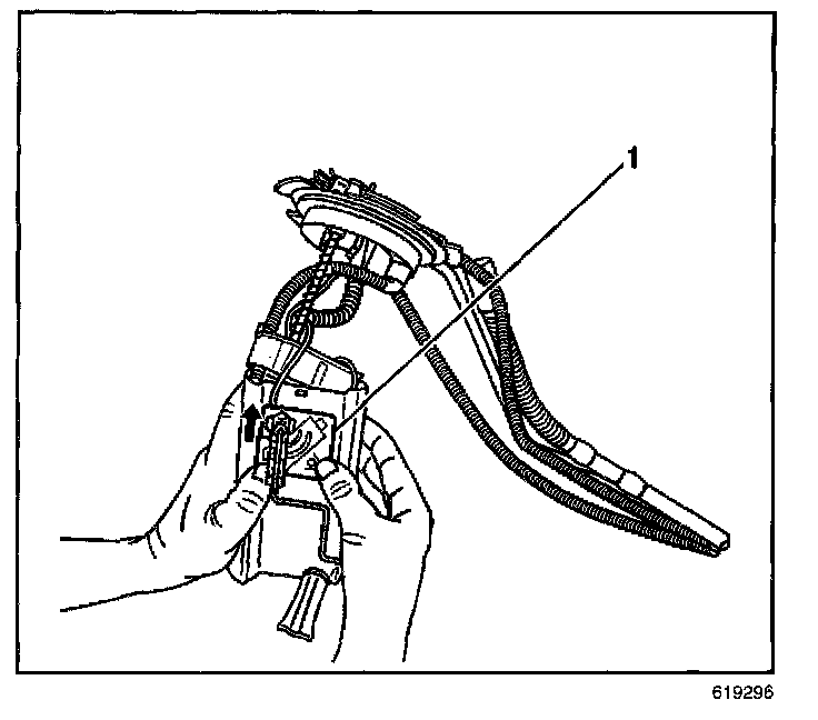 5. Depress the tab on the fuel level sensor (1) while sliding up and out of the housing.