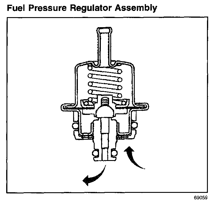 The fuel pressure regulator is a vacuum operated diaphragm relief valve with fuel pump pressure on one side and regulator spring pressure and intake manifold vacuum on the other side. The fuel pressure regulator maintains a constant pressure differential across the injectors at all times. The pressure regulator compensates for engine load by increasing fuel pressure as the engine vacuum drops.