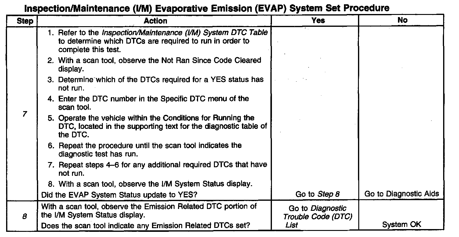 8. The I/M System Status only reports on whether or not a diagnostic has run, not the outcome of the test. If any emission related DTC sets after the tests are complete, the DTC will require diagnosis.