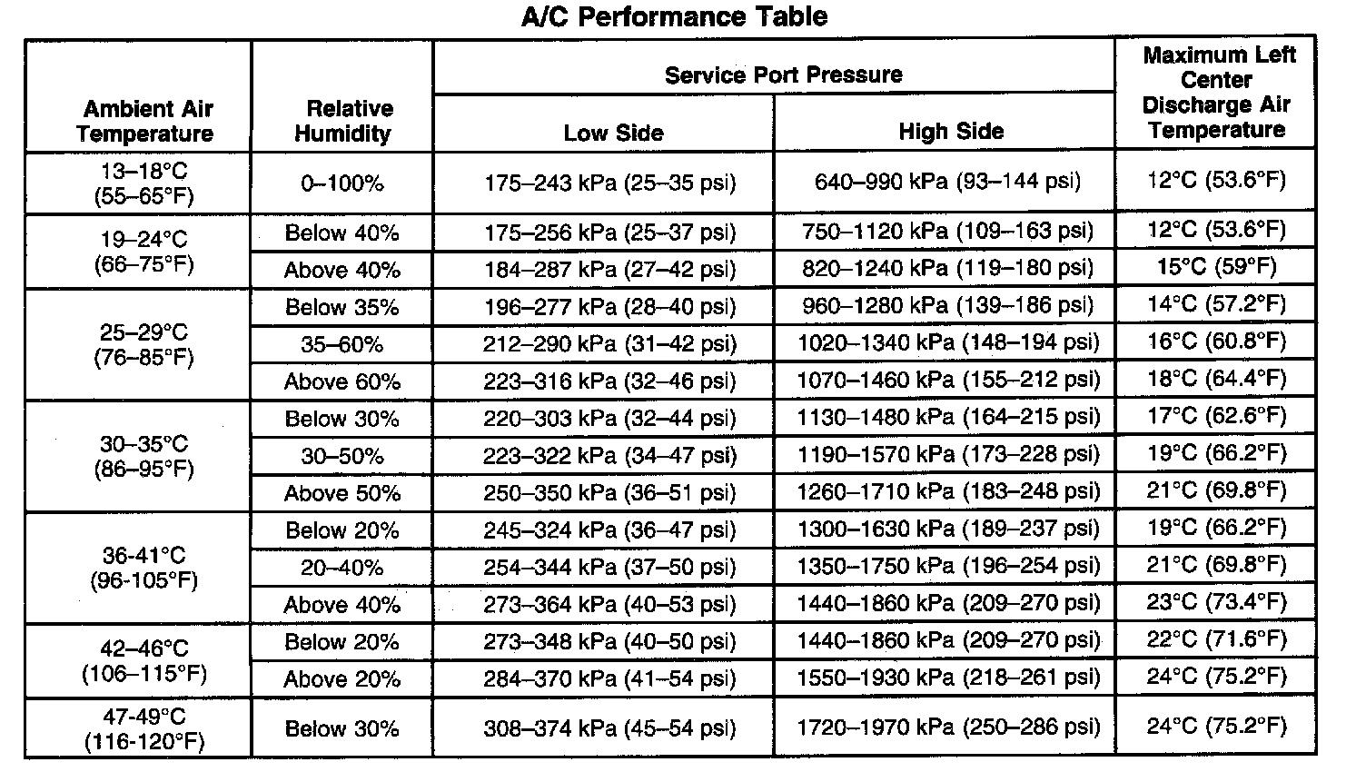 A/C Performance Table: