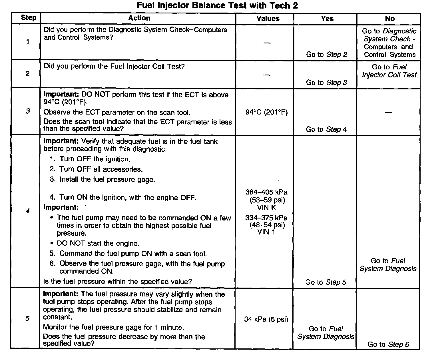 4. The fuel pressure should be within the specified range. Refer to Fuel System Diagnosis if the fuel pressure is not within the specified range. Component Tests and General Diagnostics