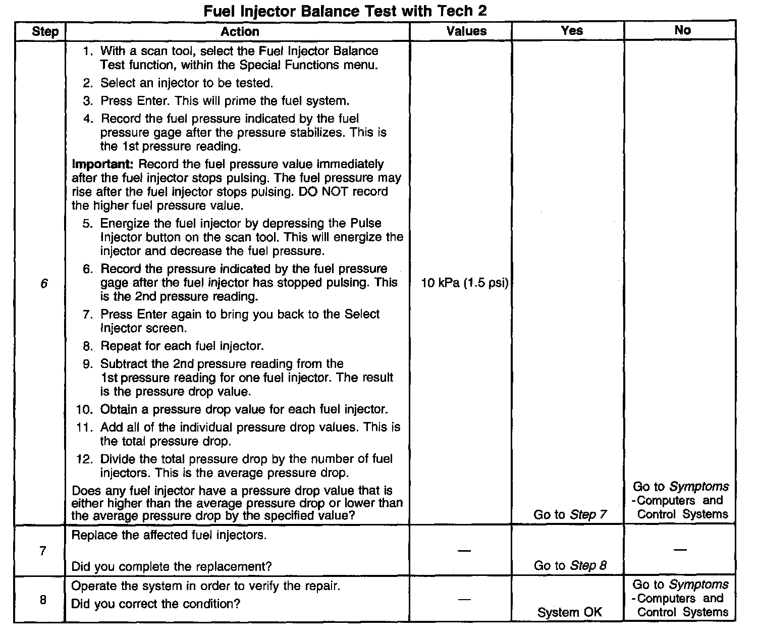 6. If the pressure drop value for each fuel injector is within 10 kPa (1.5 psi) of the average pressure drop value, the fuel injectors are flowing properly. Calculate the pressure drop value for each fuel injector by subtracting the second pressure reading from the first pressure reading.