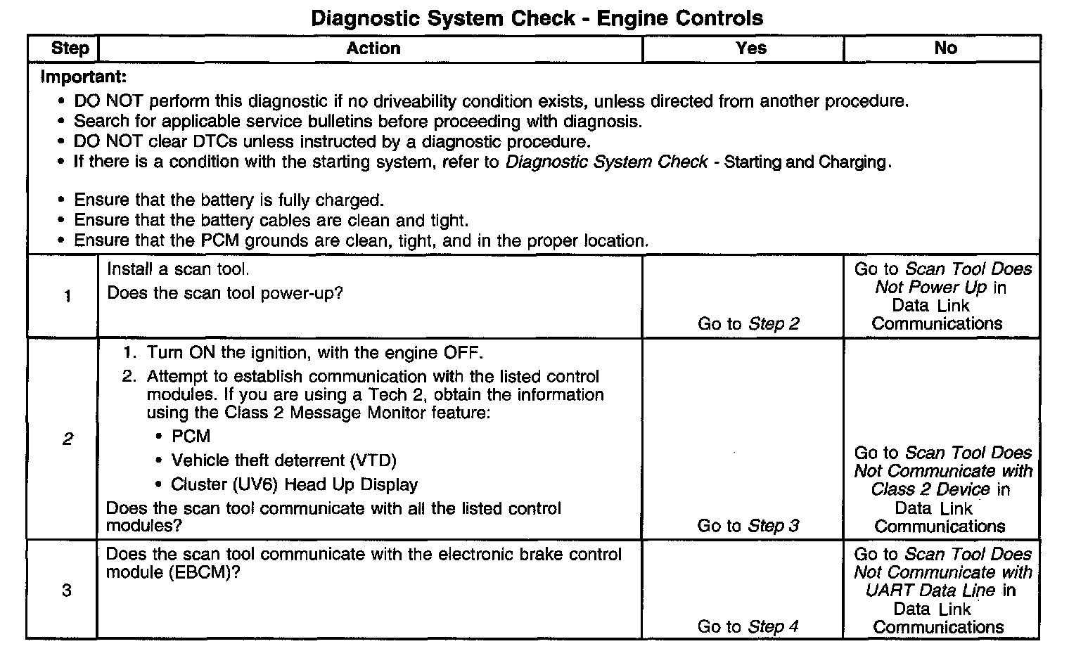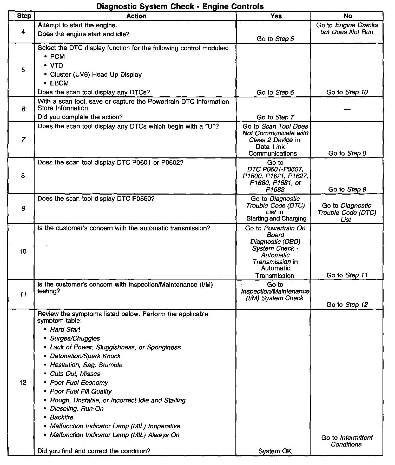 DESCRIPTIONThe Diagnostic System Check is an organized approach to identifying a condition created by an electronic engine control system malfunction. The Diagnostic System Check must be the starting point for any driveability concern. The Diagnostic System Check directs the service technician to the next logical step in diagnosing the concern. Understanding the table and using the table correctly reduces diagnostic time and prevents the replacement of good parts.