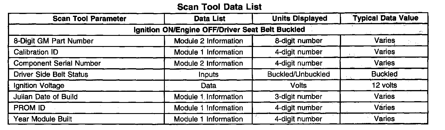 The SIR scan tool data list contains all the restraint system related parameters that are available on the scan tool. The parameters in the list are arranged in alphabetical order. The column, "Data List," indicates the location of the parameter within the scan tool menu selections.