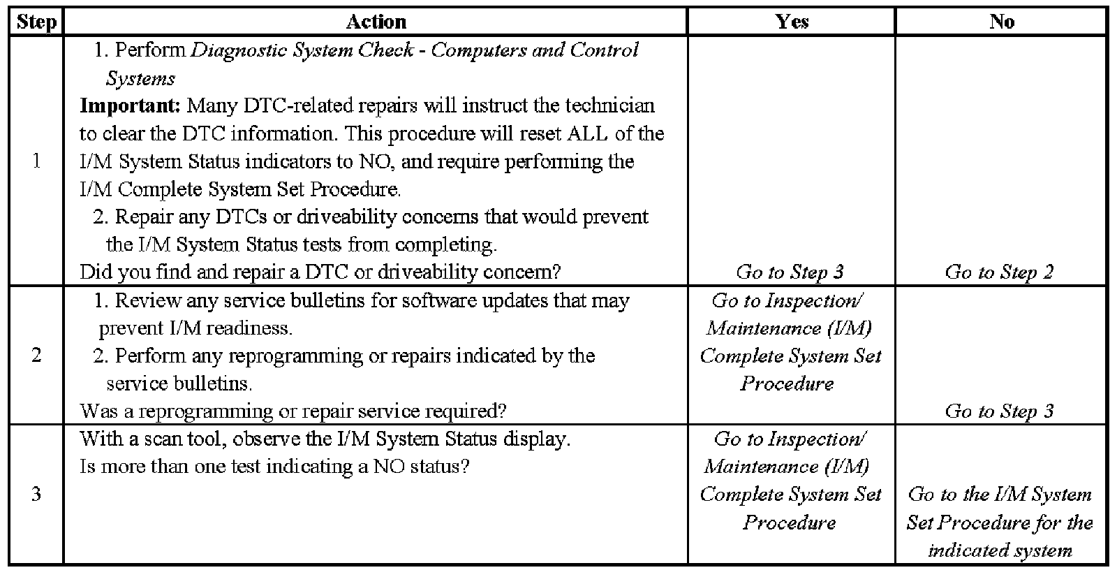 For the specific DTCs required for each system, refer to Inspection/Maintenance (I/M) System DTC Table. Systems such as fuel delivery, misfire, and comprehensive components may not be listed in a system status list. These tests run continuously on some vehicles and may not require an indicator. Inspection/Maitenance (I/M) Complete System Set Procedure