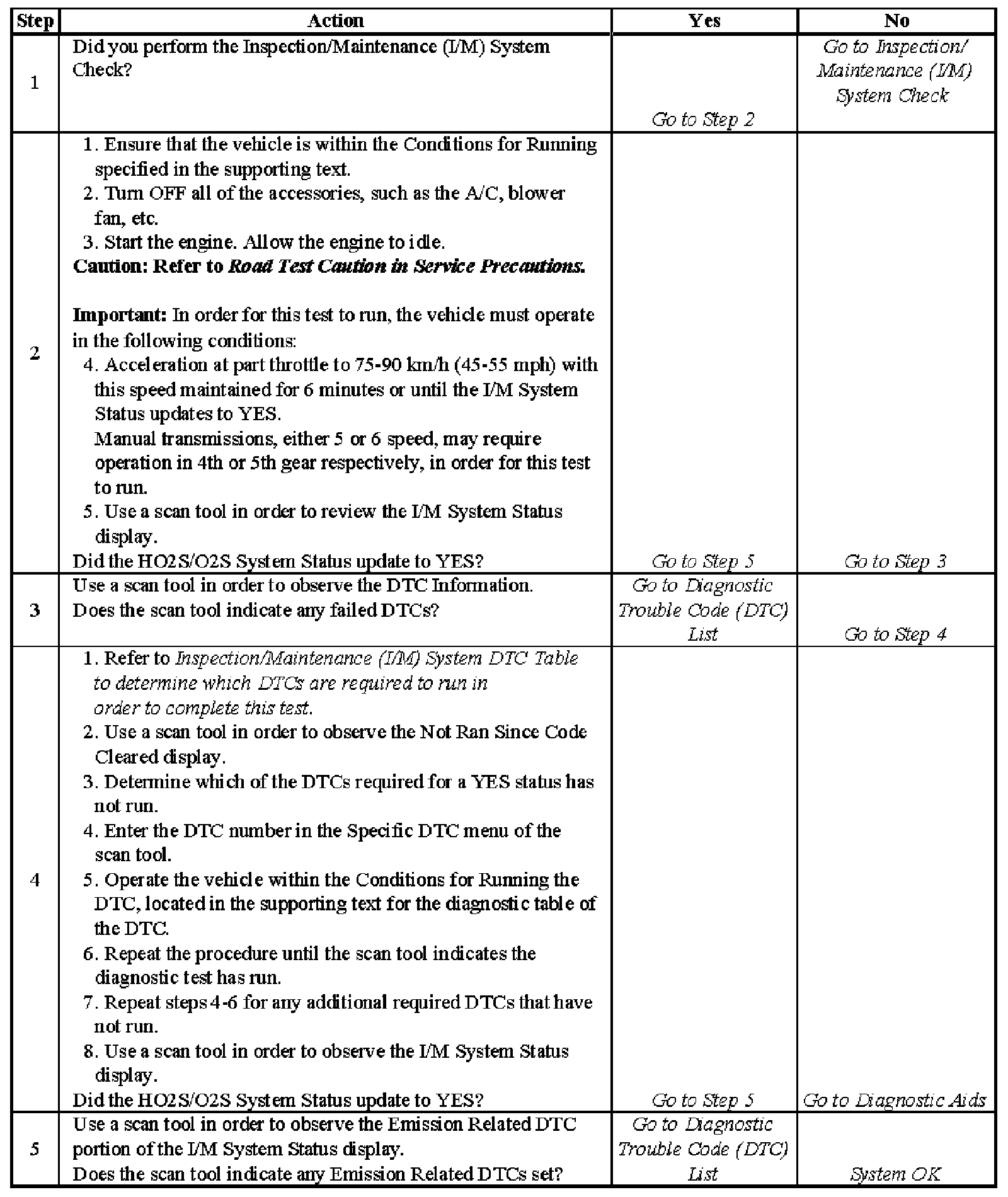 5. The I/M System Status only verifies whether a diagnostic has run, not the outcome of the test. If any Emission Related DTC sets after the tests are complete, the DTC will require diagnosis.