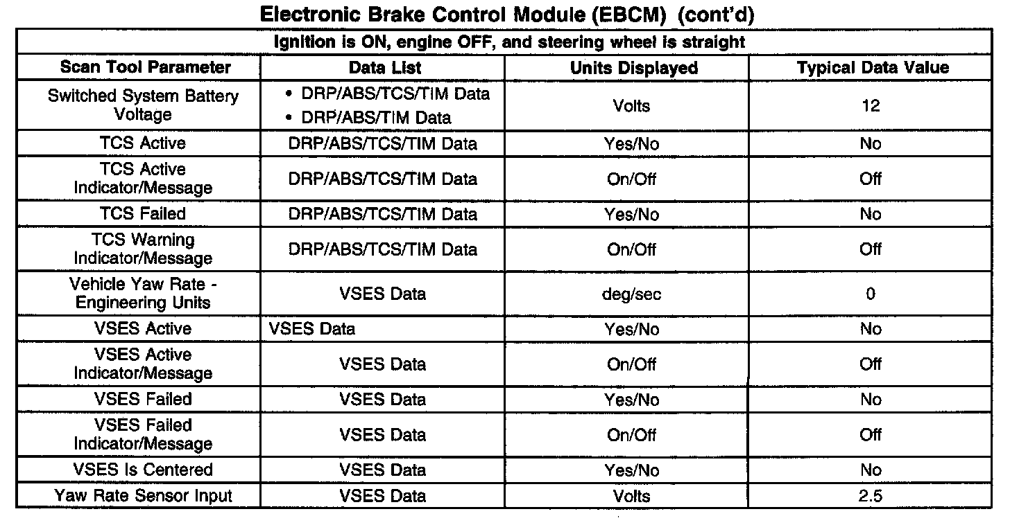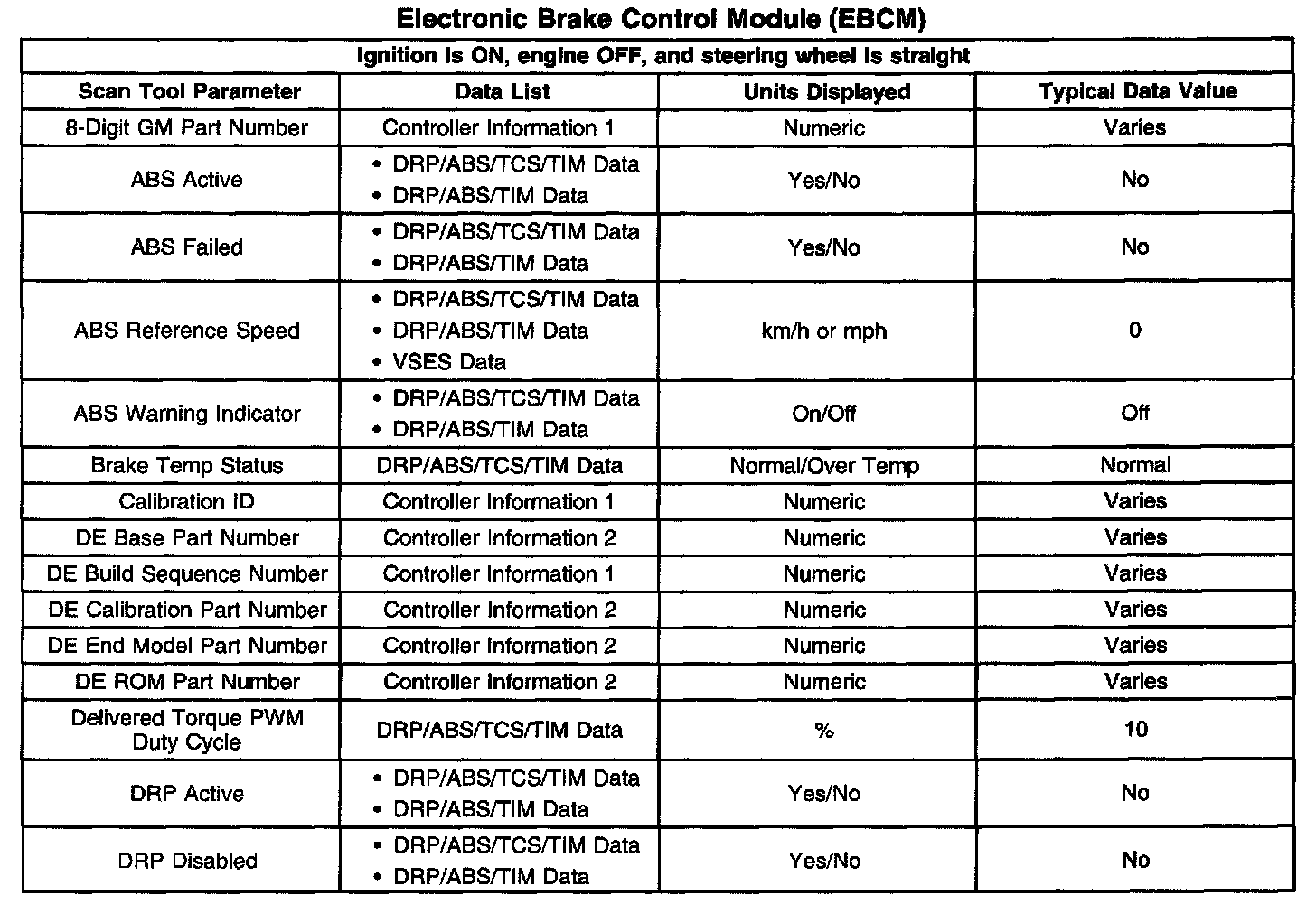 Electronic Brake Control Module (EBCM) Scan Tool Data List: