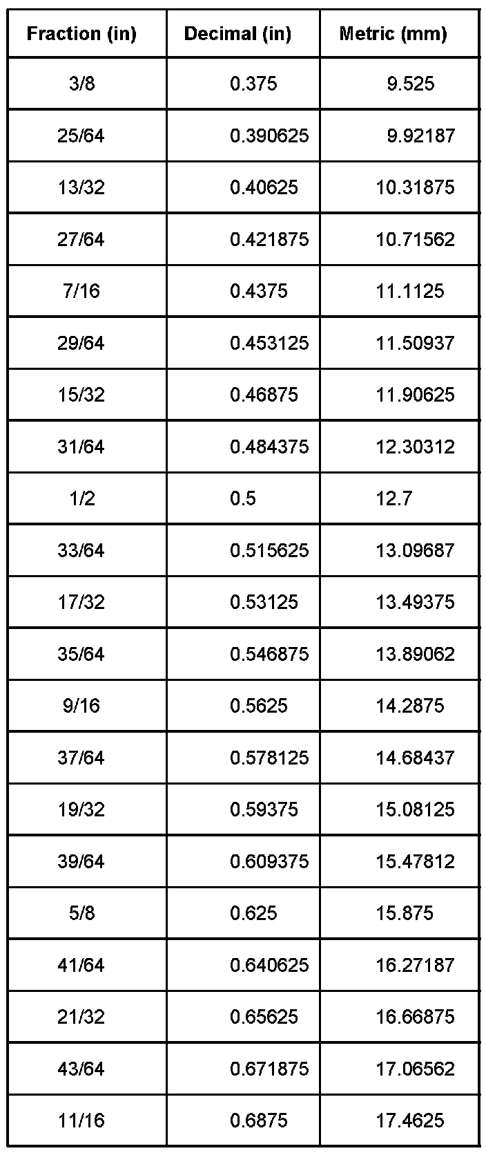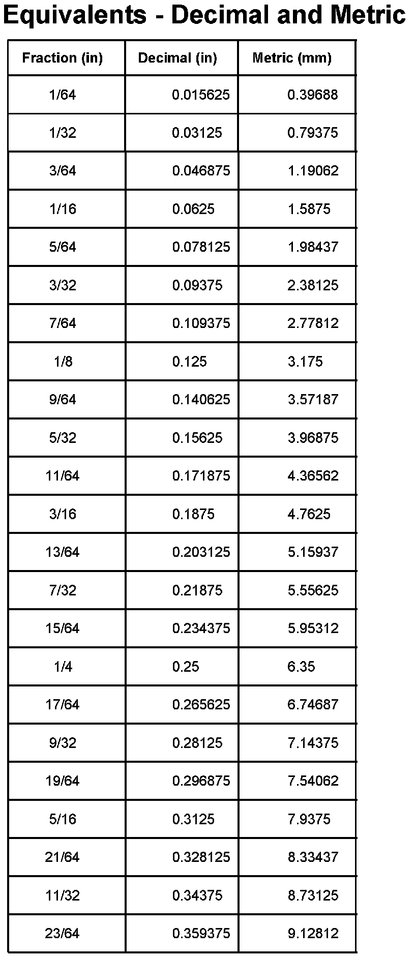 Equivalents - Decimal And Metric