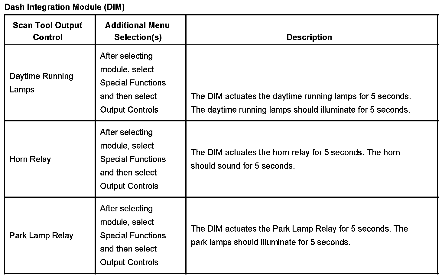 Dash Integration Module (DIM) Scan Tool Output Controls: