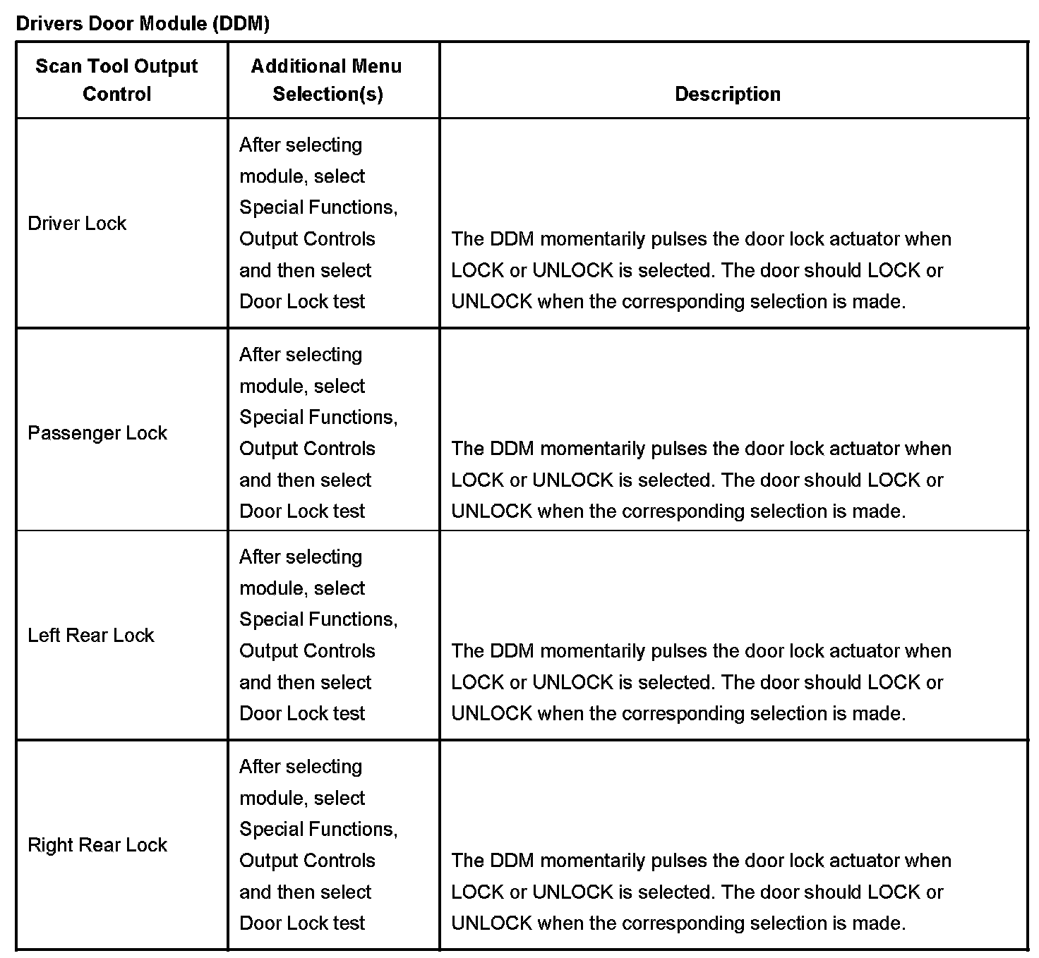 Drivers Door Module (DDM) Scan Tool Output Controls: